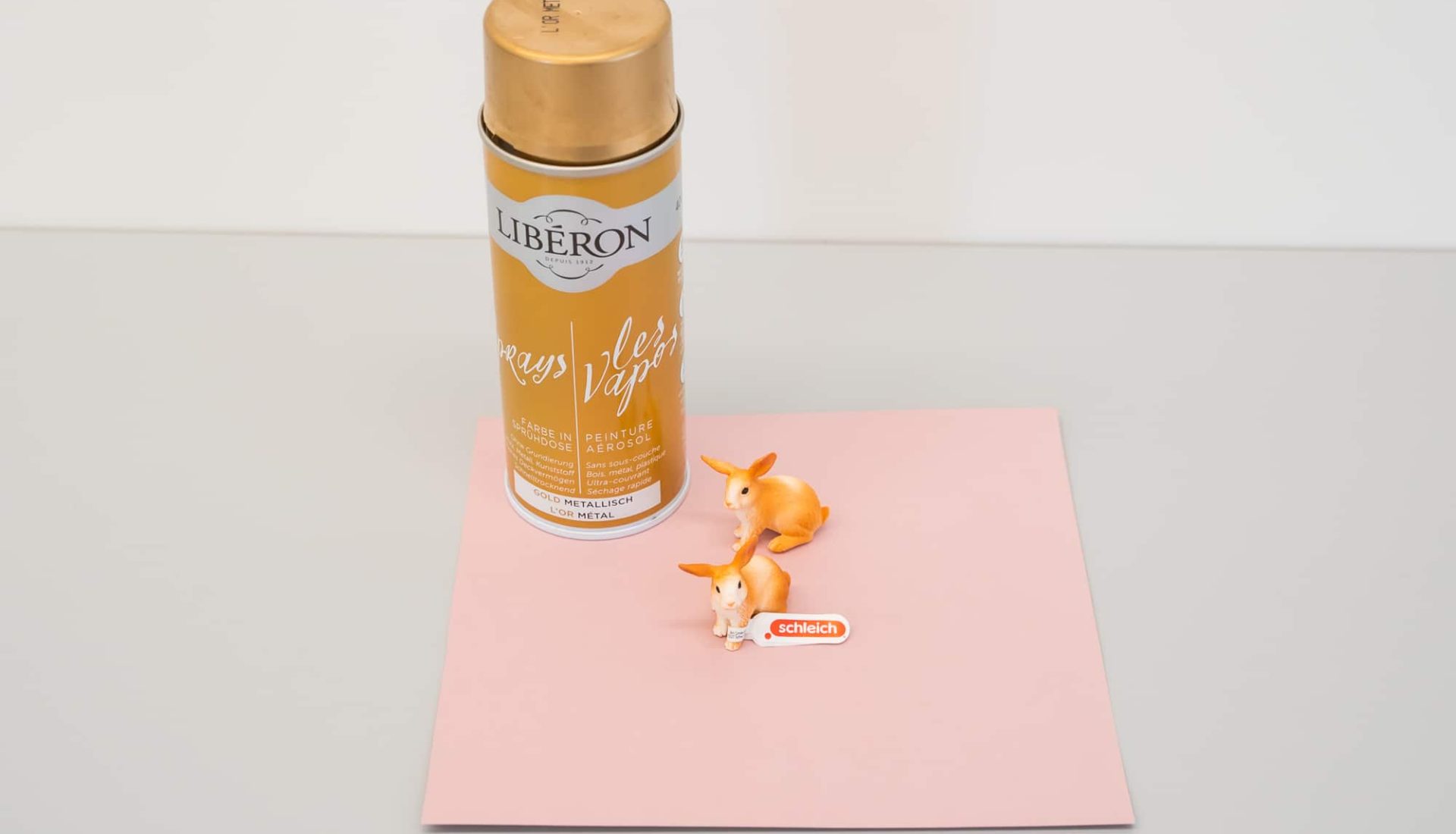 Bespraye die Hasen mit goldenem Sprühlack. Damit der Schlitz nicht zugesprayt wird, drücke vor dem Sprayen ein Papier hinein.