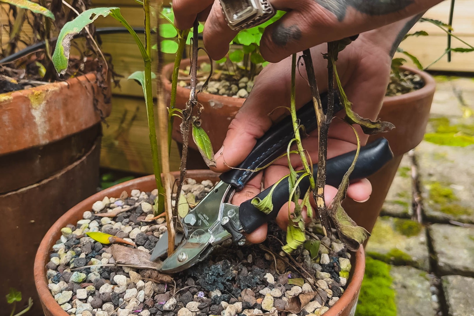 Die Stiele direkt über dem Topf schneiden und alle Blätter oberhalb der Erde entfernen damit Fäulnis vermieden wird.