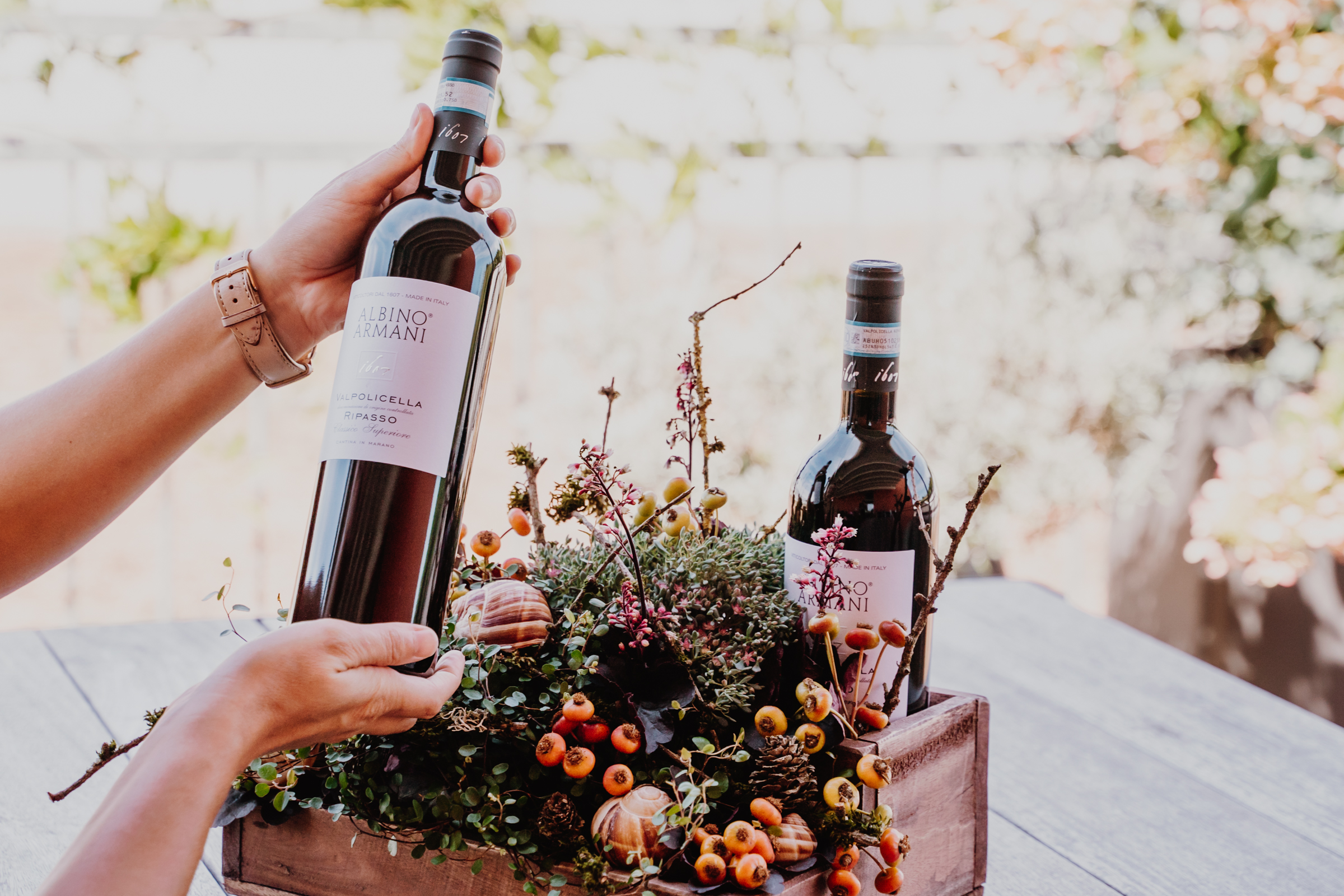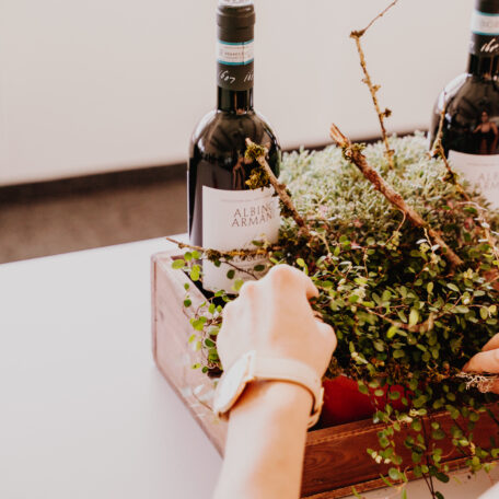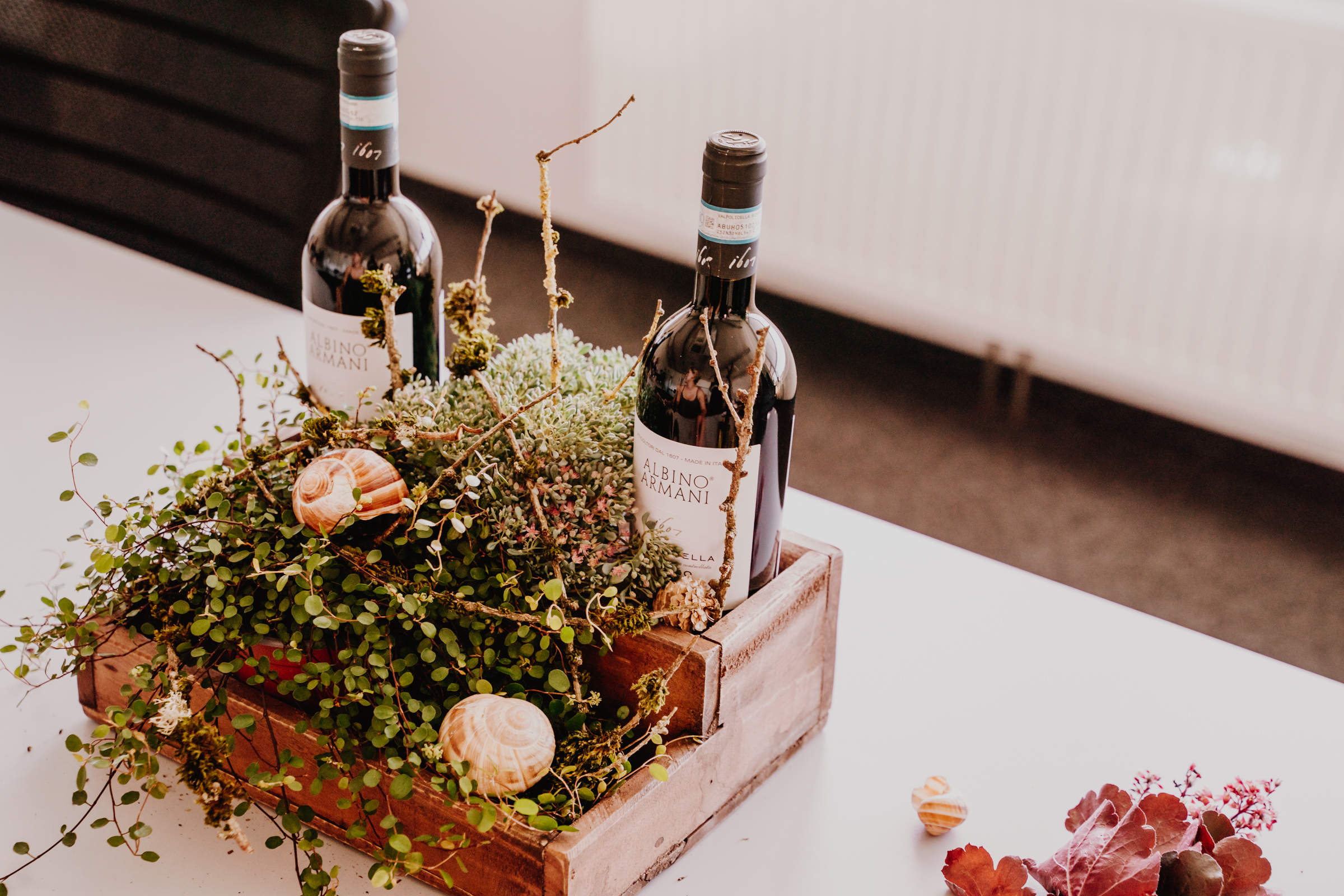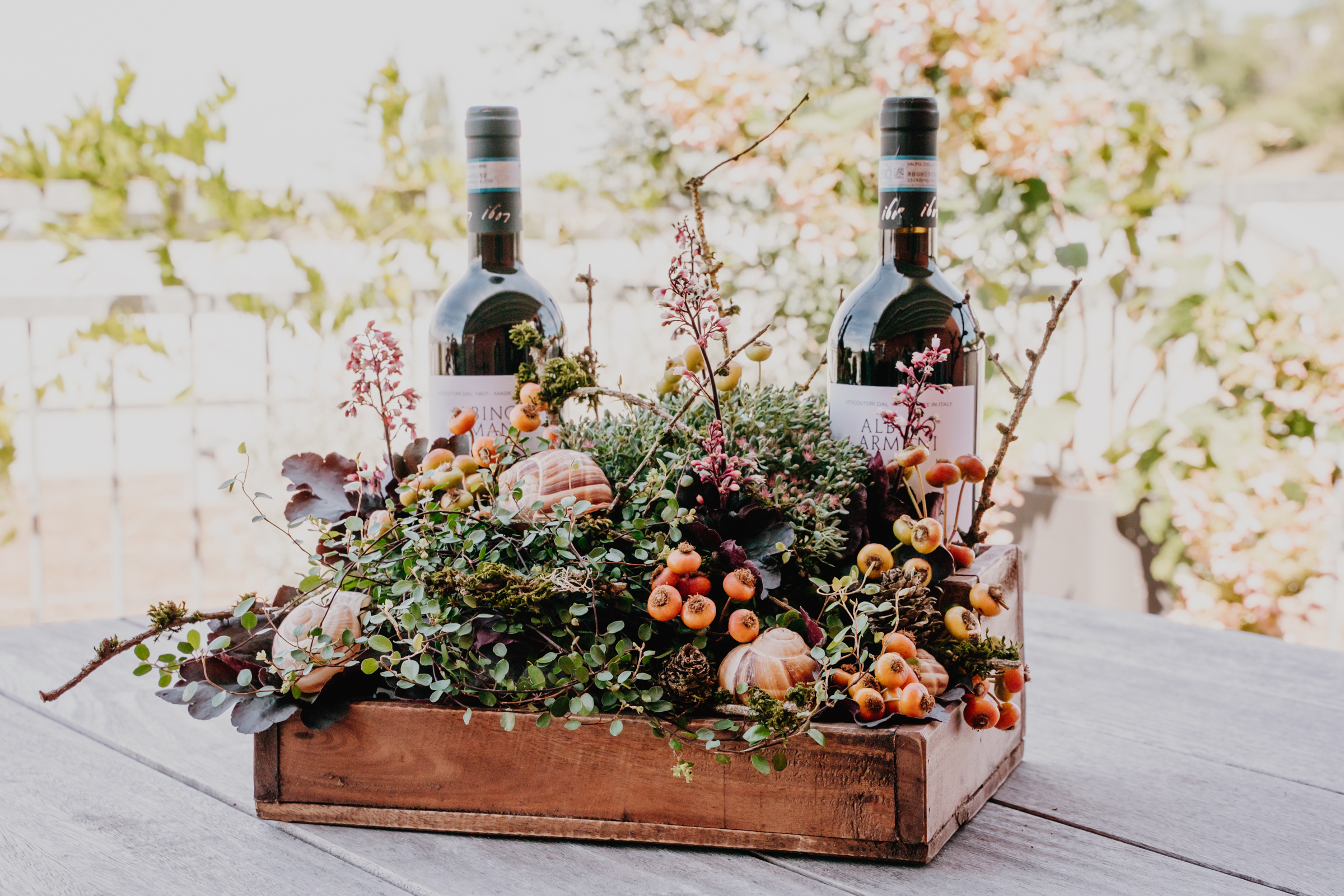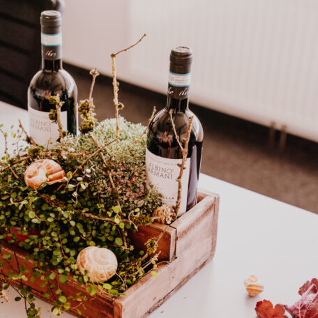 Weinflaschen in Kiste stellen und die Pflanzen platzieren (vorher leicht wässern).