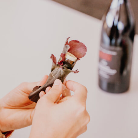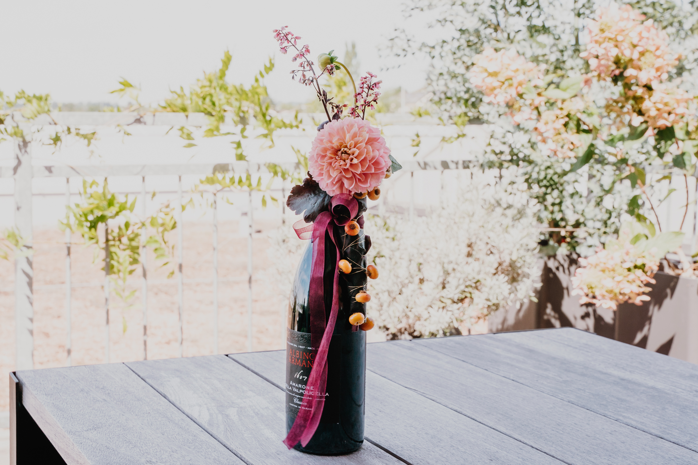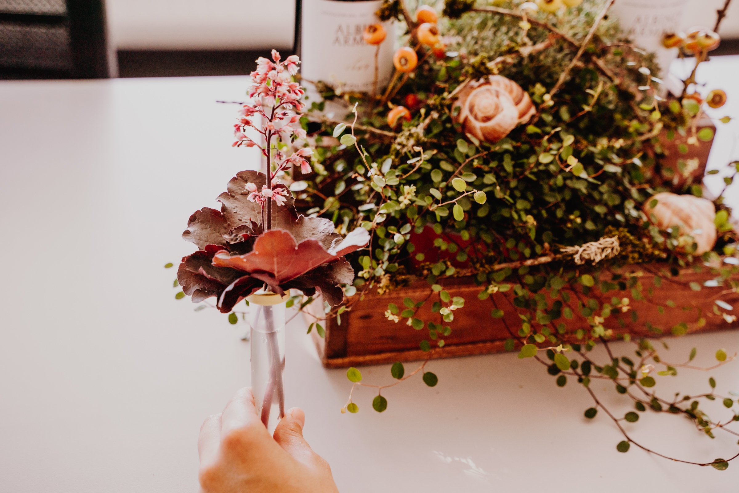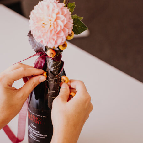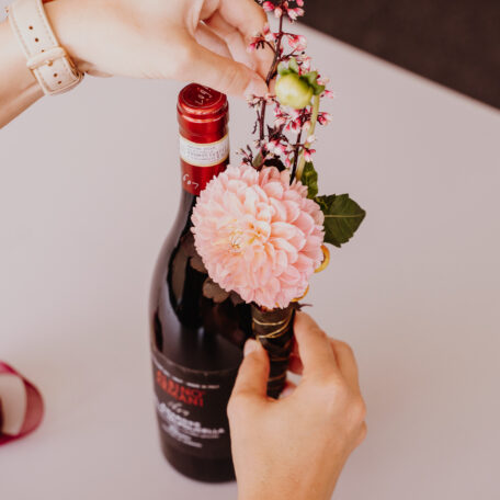 Röhrchen mit Dahlie und weiteren Heucherablättern füllen und mit Band an der Flasche befestigen.