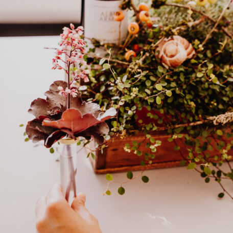 Heucherablätter mit Draht am Gesteckröhrchen festbinden, damit sie es etwas cachieren. Gesteckröhrchen mit Wasser füllen und Deckel schliessen.