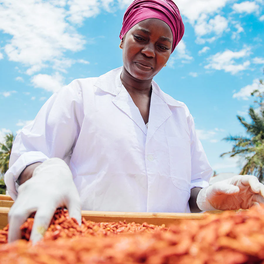 Die Chilis werden von Hand gepflückt, wenn sie reif sind. Nach dem Sortiervorgang werden die Chilis sorgfältig in der Sonne getrocknet, bevor die letzten Stiele auf dem Sortiertisch entfernt werden. Unsere Landwirte befinden sich hauptsächlich auf dem Festland von Tansania, in der Region Kigoma.