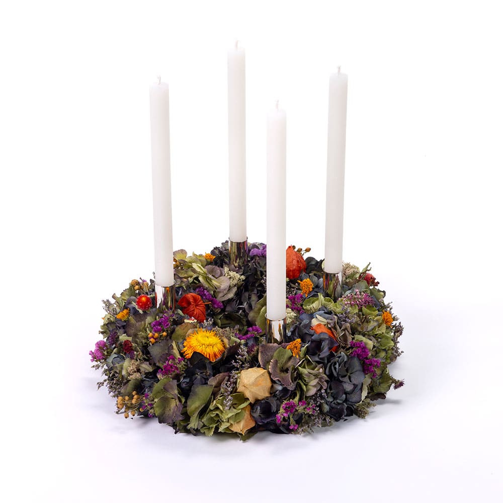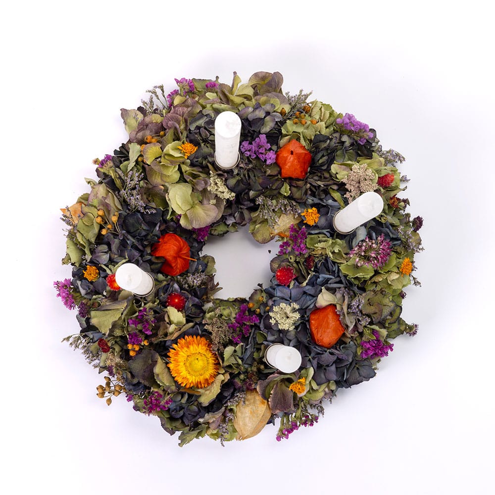Adventskranz Trockenblumen Bunt, Kerzen Elfenbein – ca. 35 cm Durchmesser