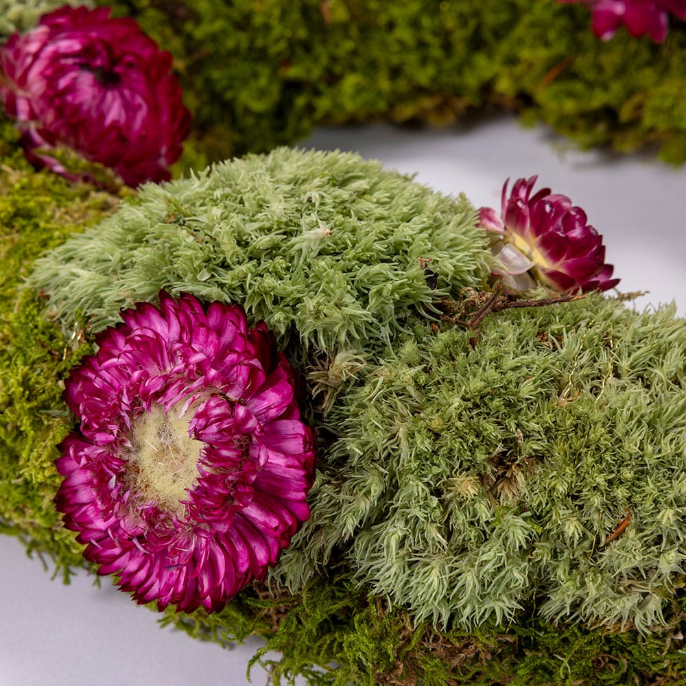 Dieser Adventskranz sorgt bestimmt für eine zauberhafte Atmosphäre bei dir zu Hause. Bei diesem Kranz werden verschiedene Moosarten schön auf dem Strohkranz arrangiert und mit hübschen Strohblumen dekoriert. Auch bei unseren Adventskränzen arbeiten wir so natürlich wie möglich und verzichten daher auf Heiss- und Sprühkleber, Farbspray und Steckschaum.