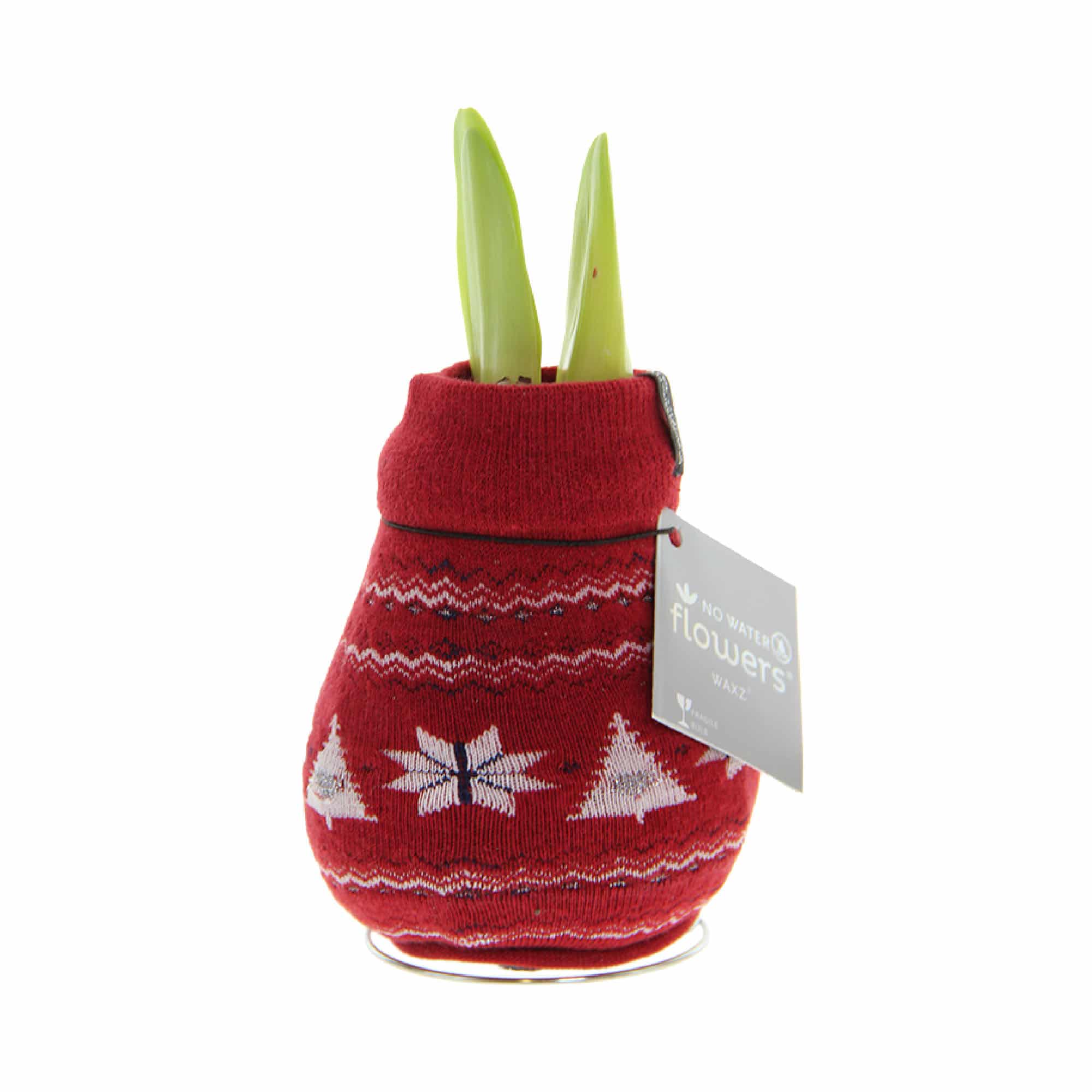 Die Amaryllis ist ein ungewöhnlicher Blickfang, denn über die Amaryllis-Zwiebel ist eine rote Norwegersocke gestülpt.