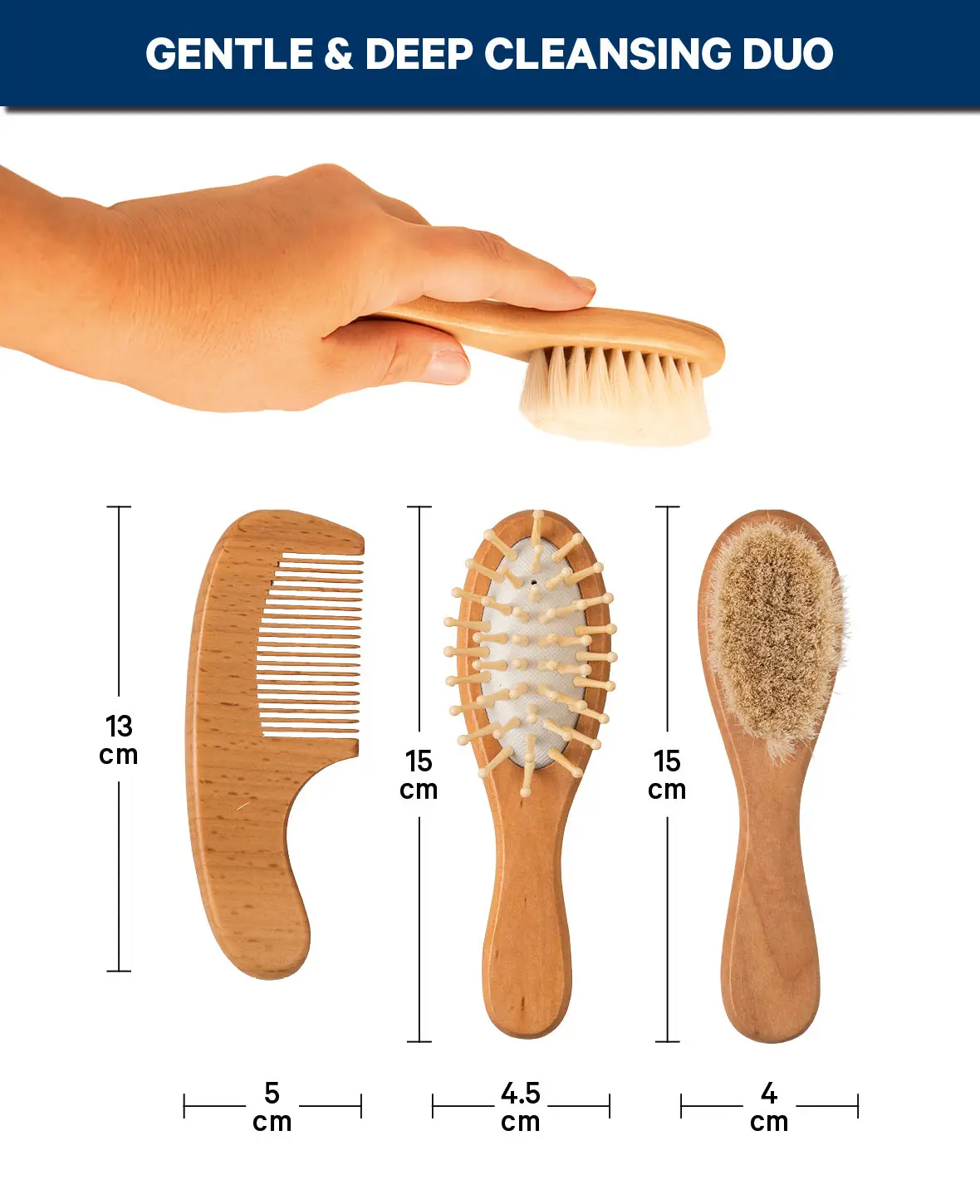 Das natürliche Babybürsten-Set ist das ideale Pflegeaccessoire für Neugeborene und Kleinkinder. Jede Bürste wurde sorgfältig aus hochwertigem Buchenholz gefertigt und bietet eine sichere, sanfte Pflege für empfindliche Babyhaut. Die weiche Ziegenhaarbürste beruhigt und hilft, Milchschorf zu lösen, während die Massagebürste mit abgerundeten Holzstiften die Kopfhaut stimuliert und das Haarwachstum unterstützt. Der fein gearbeitete Holzkamm sorgt für leichtes Entwirren und Stylen. Nachhaltig, handlich und liebevoll gestaltet – perfekt für die tägliche Pflege oder als durchdachtes Geschenk zur Geburt.