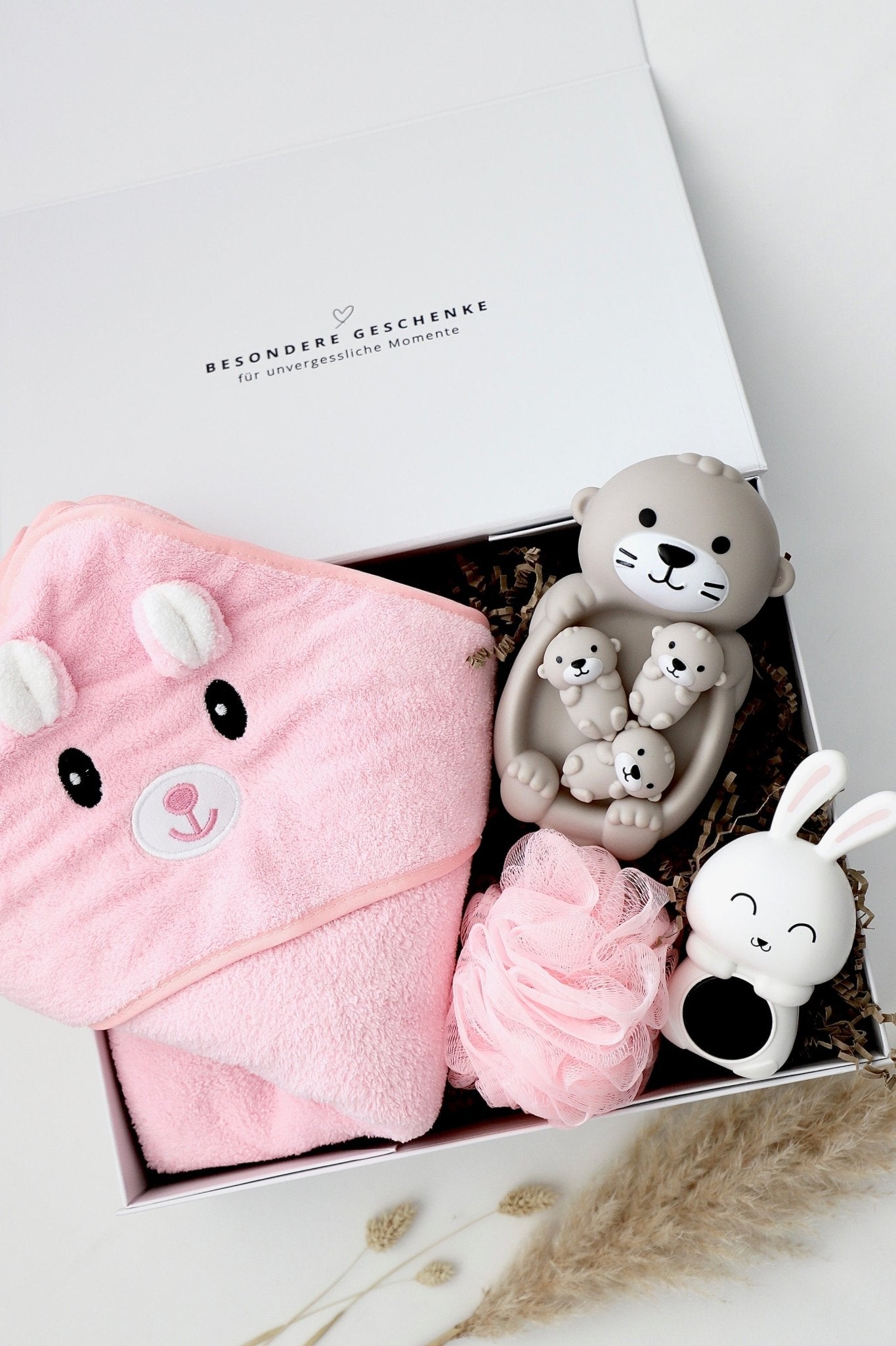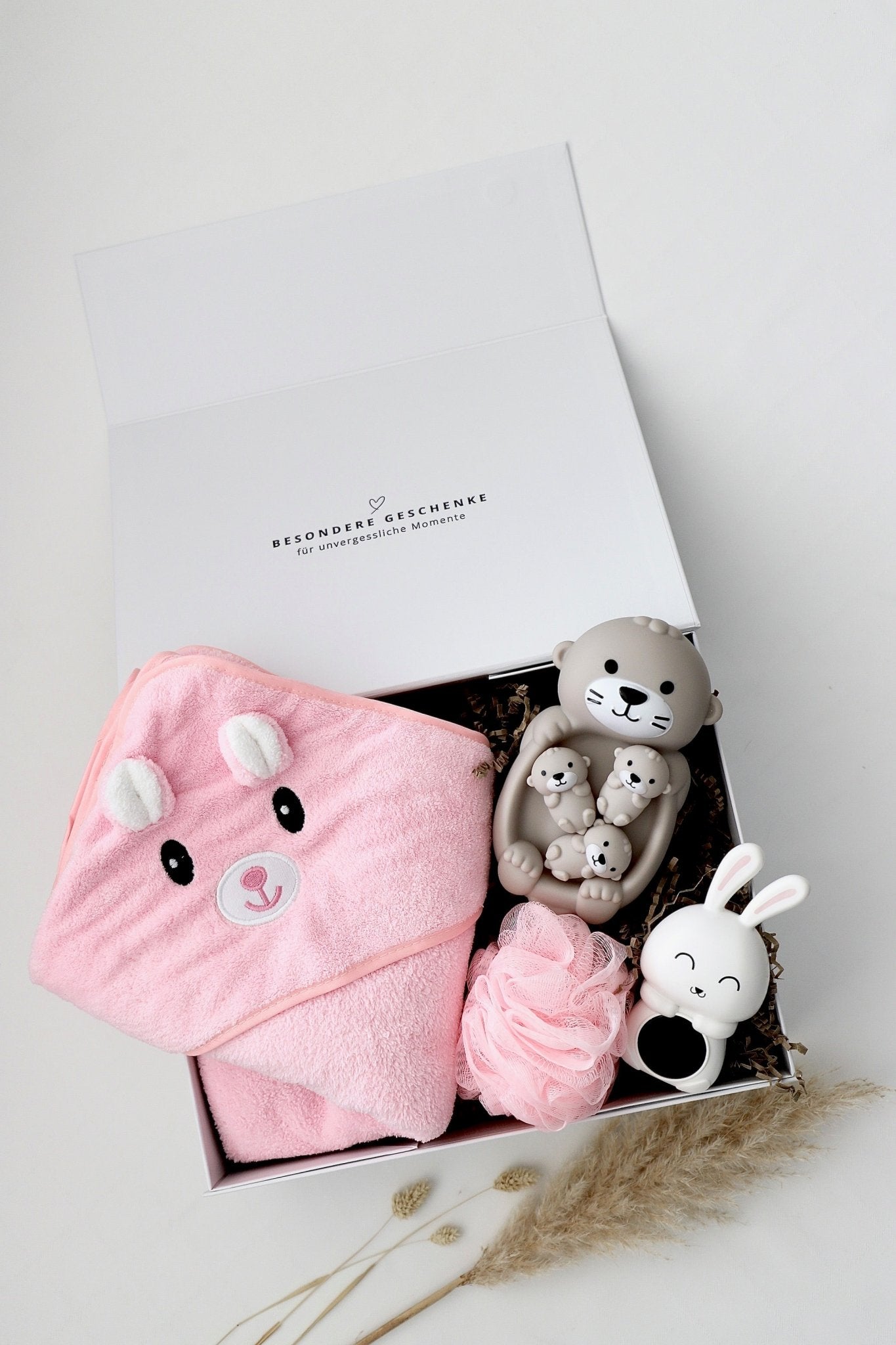 Die Badebox Rosa ist das perfekte Geschenk für kleine Prinzessinnen und ihre Eltern. Enthalten sind ein weiches Kapuzenhandtuch im süssen Bärchen-Design, ein Otter-Spielzeug-Set, ein rosa Badeschwamm sowie ein niedliches Hasen-Badethermometer.