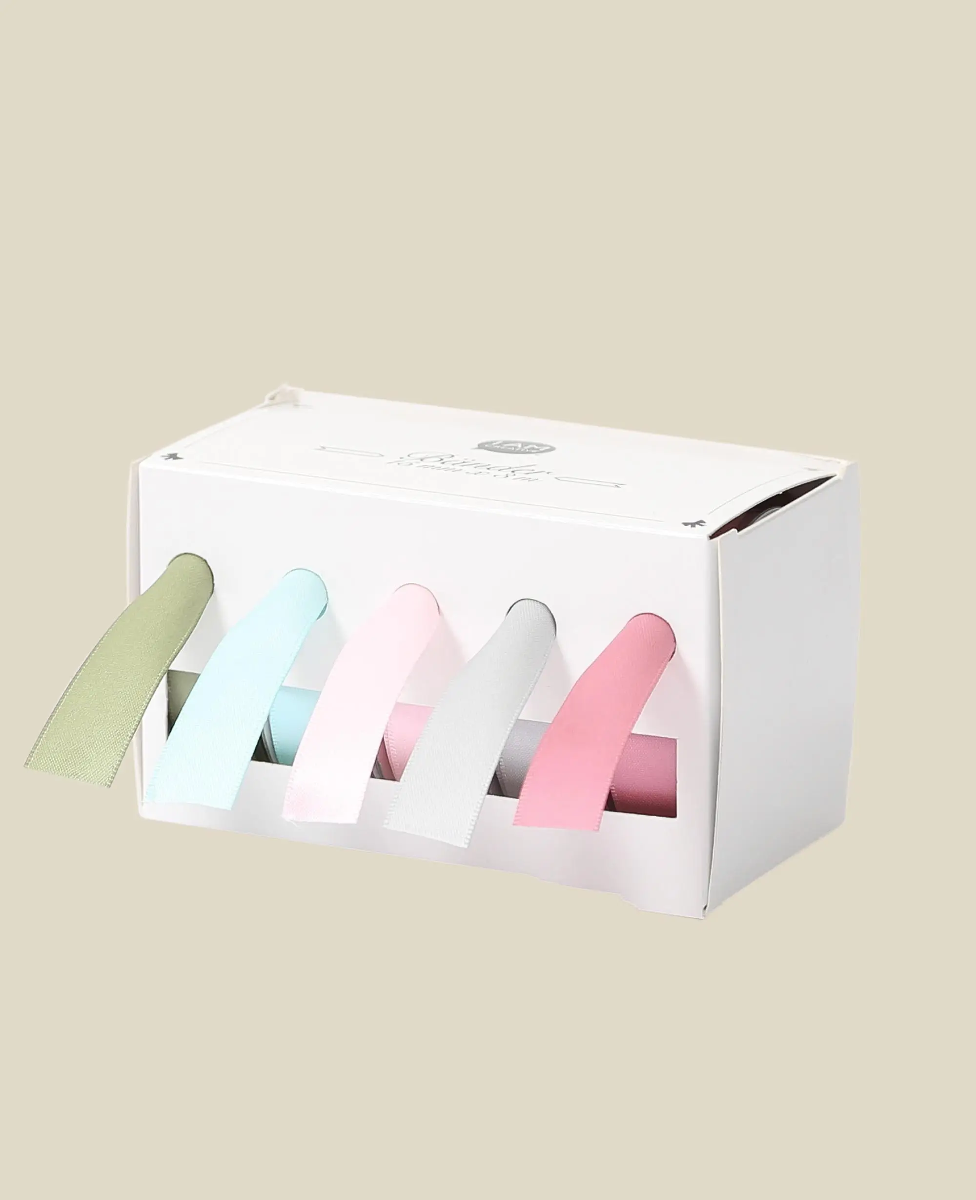 Bänder in Box, Geschenkbänder in praktischer Aufbewahrungsbox mit assortieren Bändern, Softfarben, 10 mm x 3 m, 5 Motive