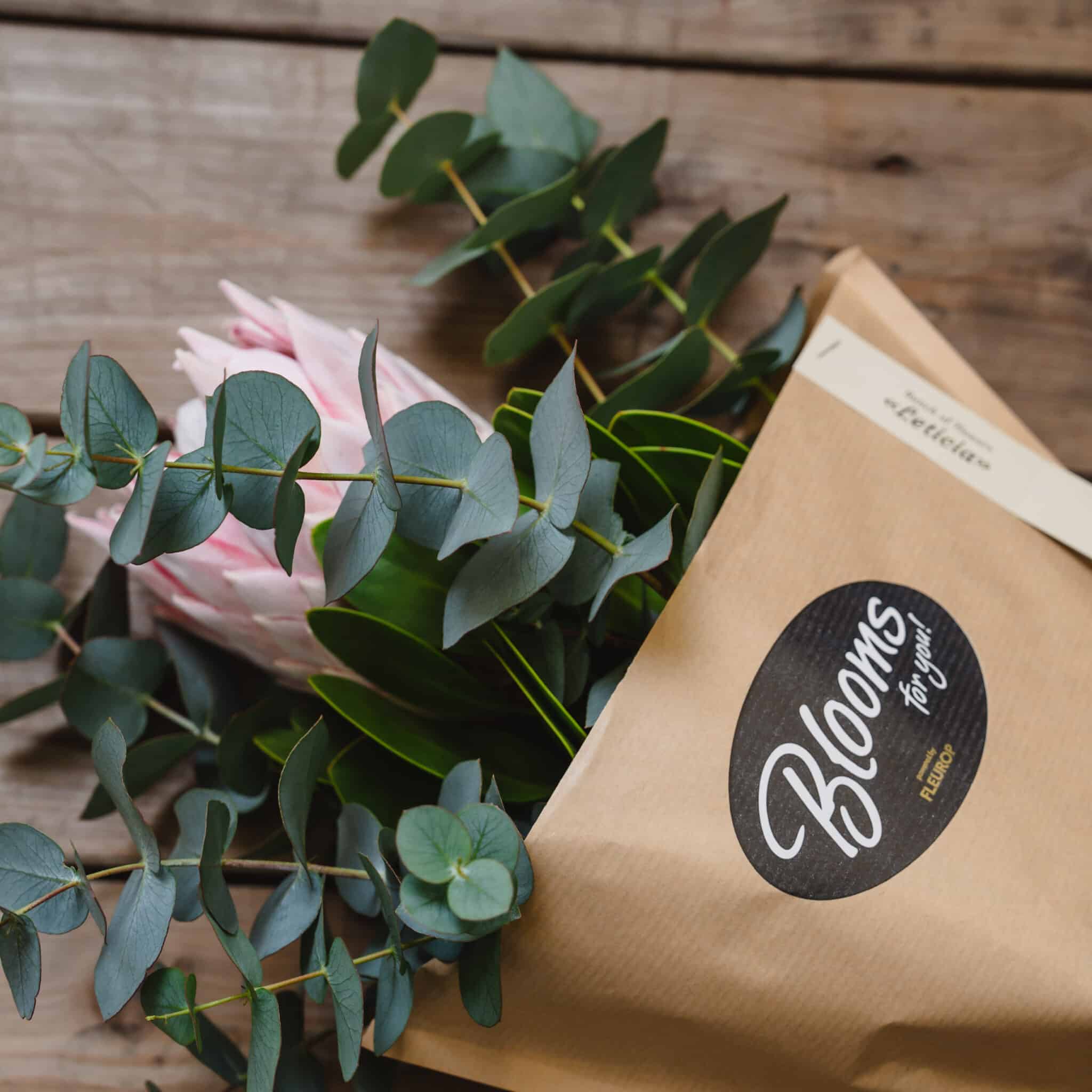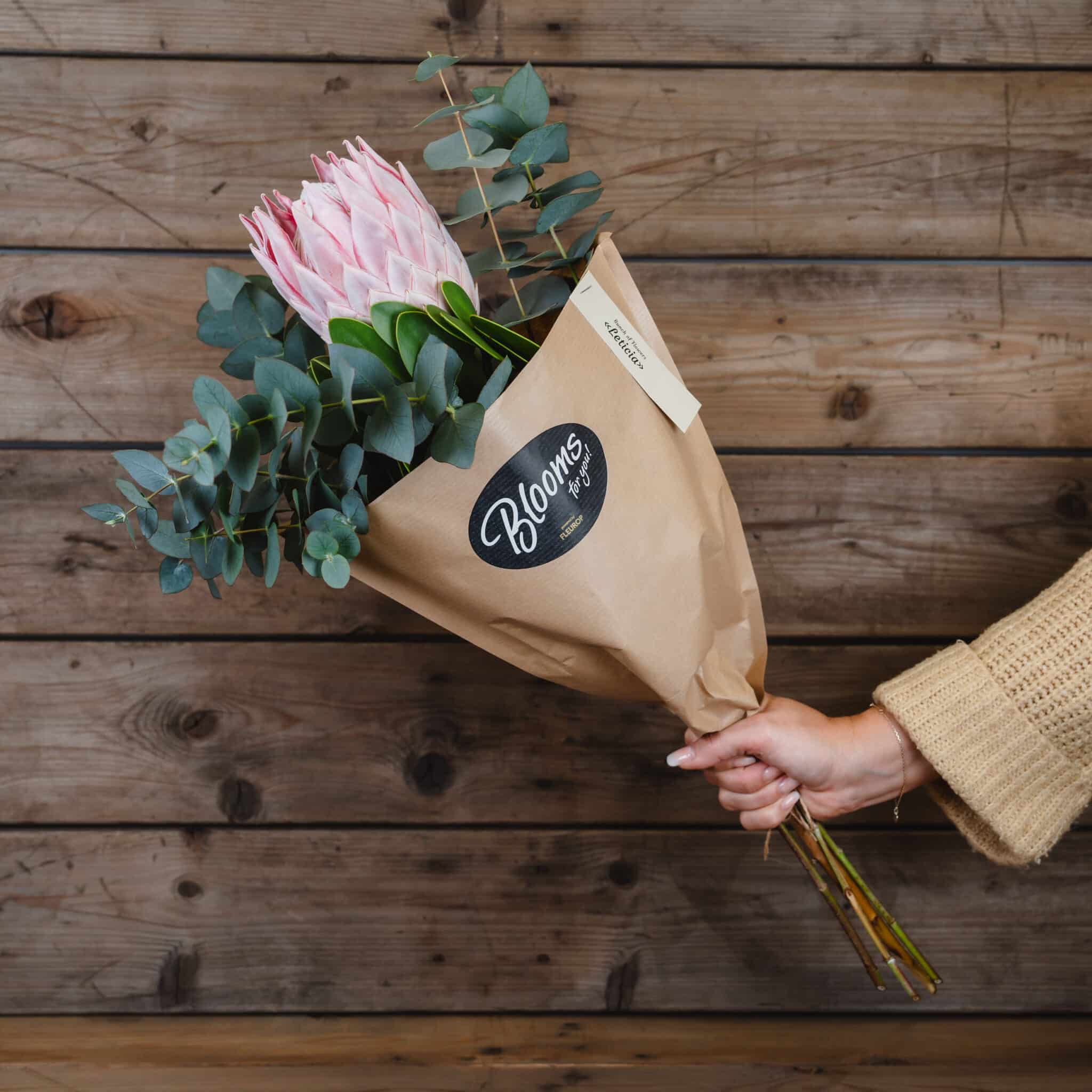 Königs-Protea in Rosa mit Eukalyptus, in Blumentüte aus Kraftpapier