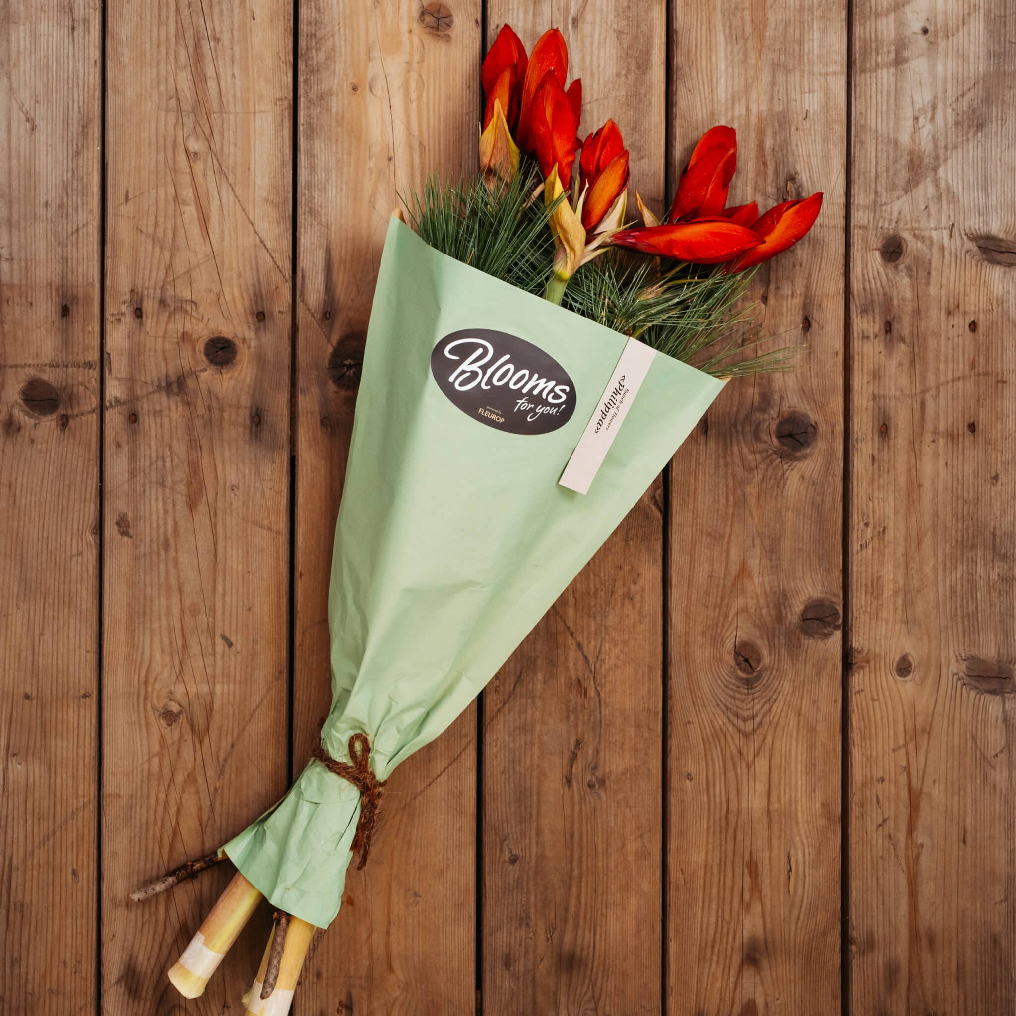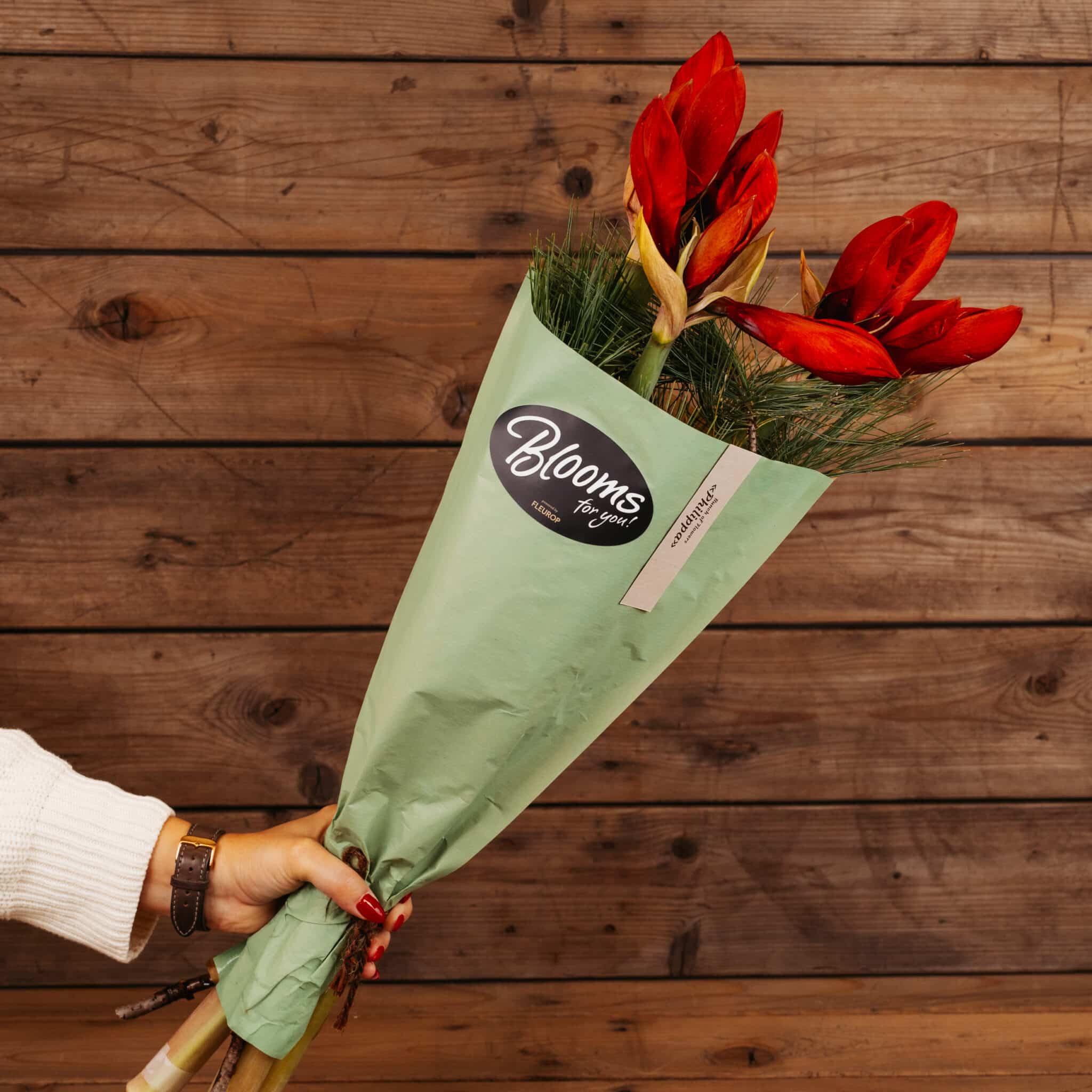 Amaryllis in Rot (3 Stiele) mit Föhrenzweigen, in Misty Green Blumentüte