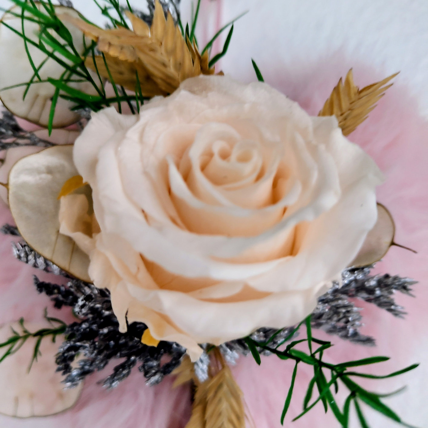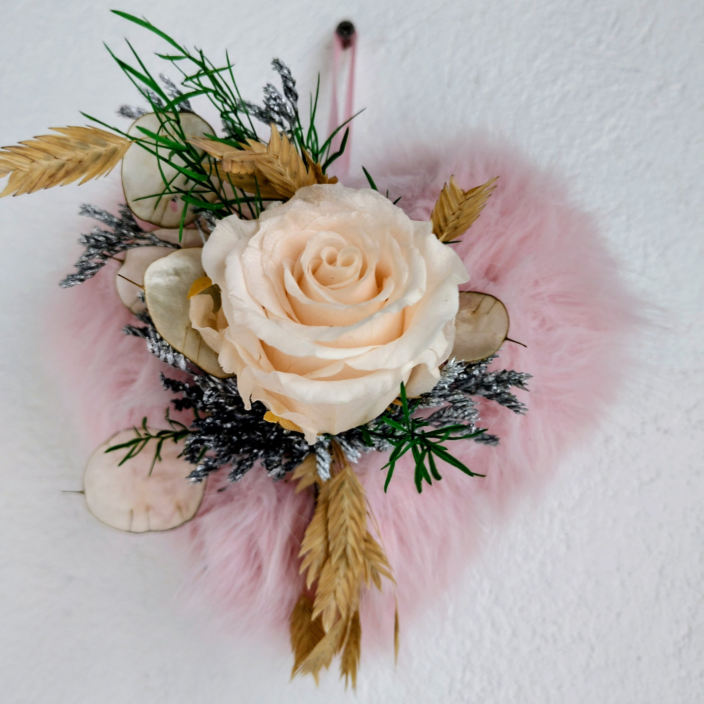 Dieses wunderschöne rosa Herz, bestehend aus einer konservierten helllachsfarbenen Rose und getrockneten Pflanzen, ist ein wunderschönes Geschenk zum Muttertag und zu allen anderen Anlässen.