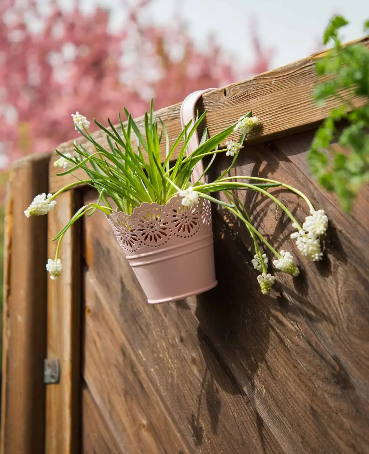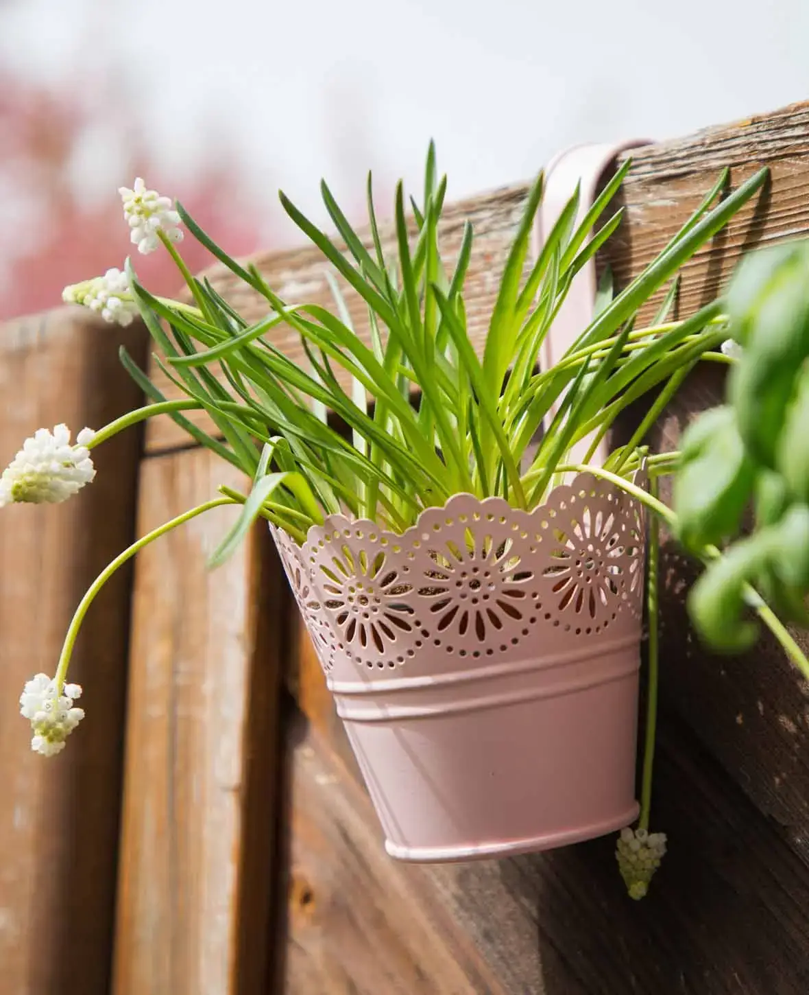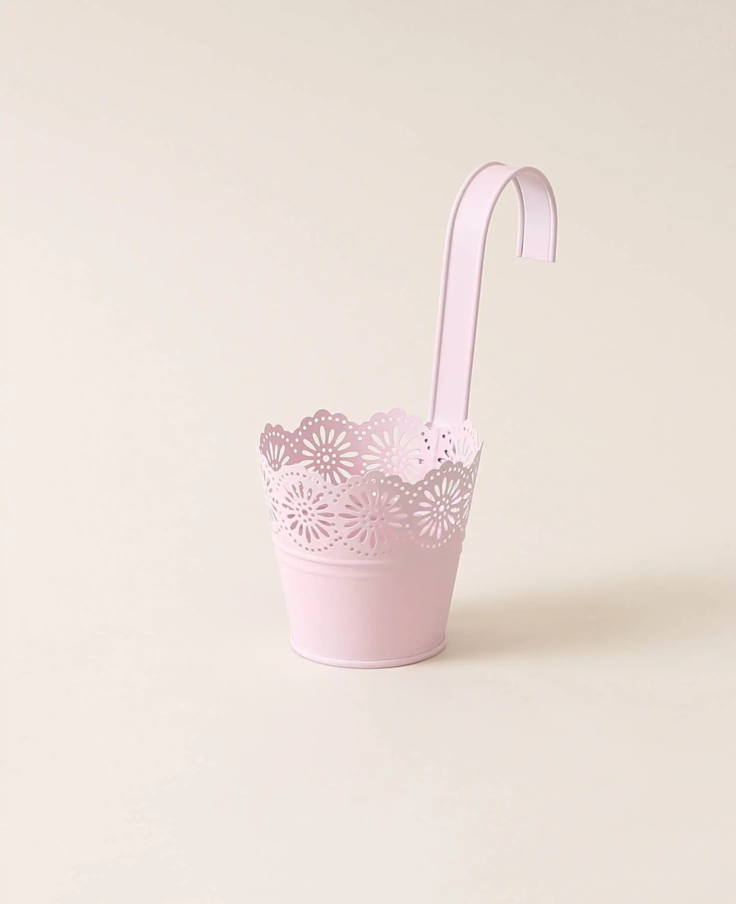 Matt-rosa Blechtopf mit Spitzenverzierung und Haken, D11 x H22 cm