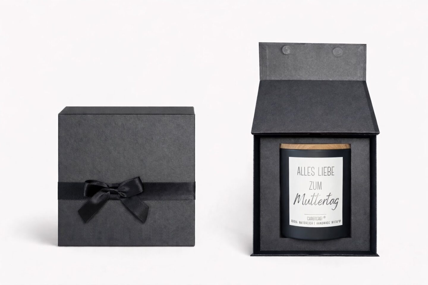Duftkerze in 3 verschiedenen Duftrichtungen mit edler, schwarzmatter Geschenkverpackung mit Satinschleife und transportsicherem Inlay.