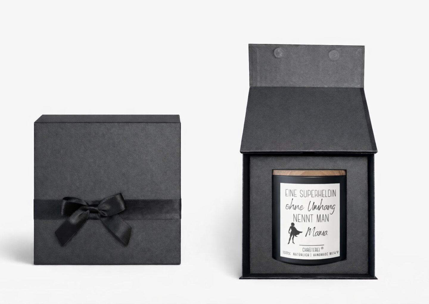 Duftkerze in 3 verschiedenen Duftrichtungen mit edler, schwarzmatter Geschenkverpackung mit Satinschleife und transportsicherem Inlay.