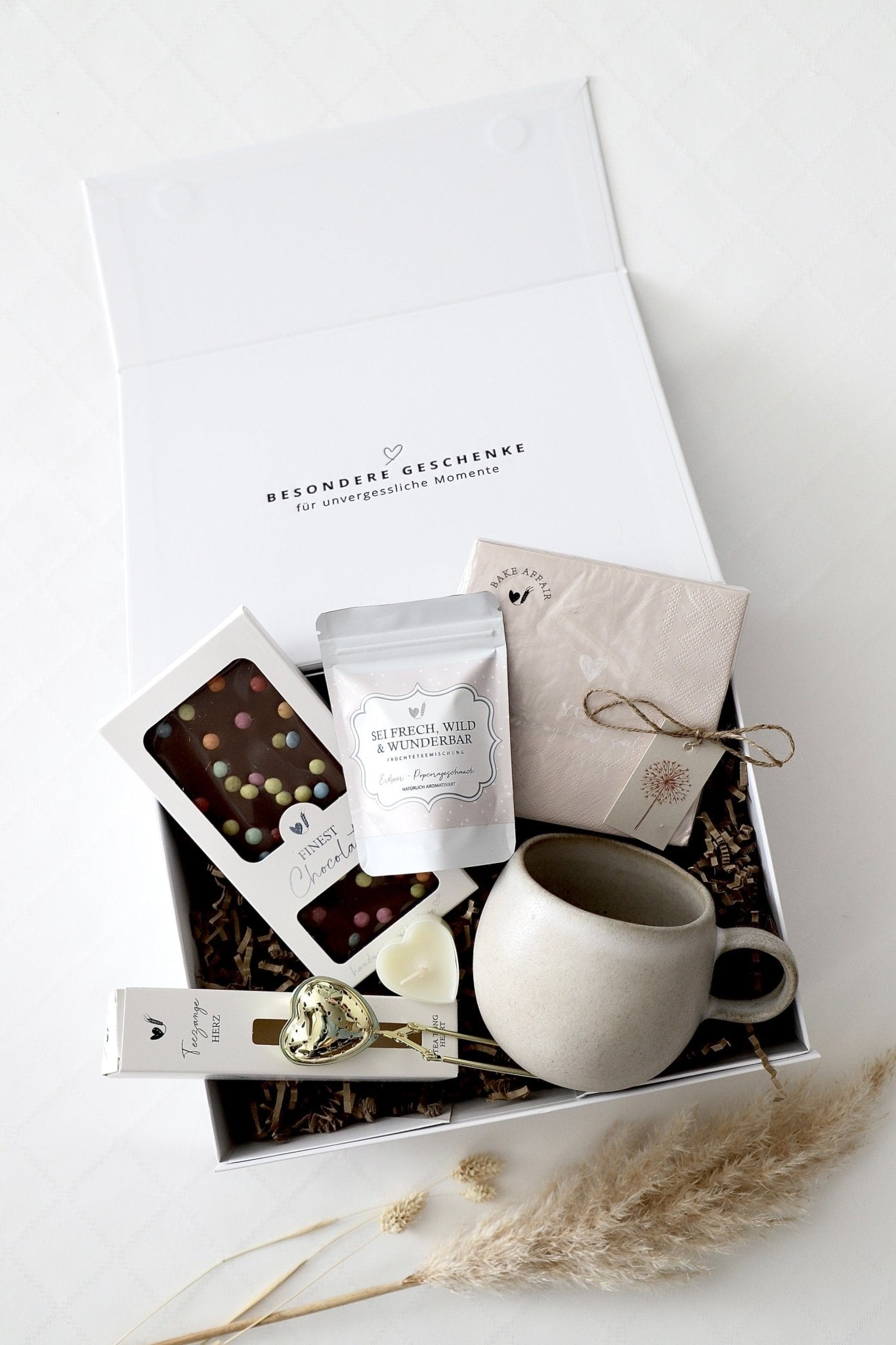 Die „Choco Tea Delight“-Box ist die perfekte Kombination aus Teegenuss und süsser Versuchung. Feiner Tee trifft auf eine edle Schokolade und liebevolle Details, die jede Teepause zu einem besonderen Erlebnis machen. Mit stilvoller Tasse, goldenem Herz-Teesieb und Kerzenlicht wird aus einem einfachen Moment eine kleine Auszeit voller Genuss. Ideal für Schokoladenliebhaber, Teefans und alle, die sich selbst oder andere verwöhnen möchten.