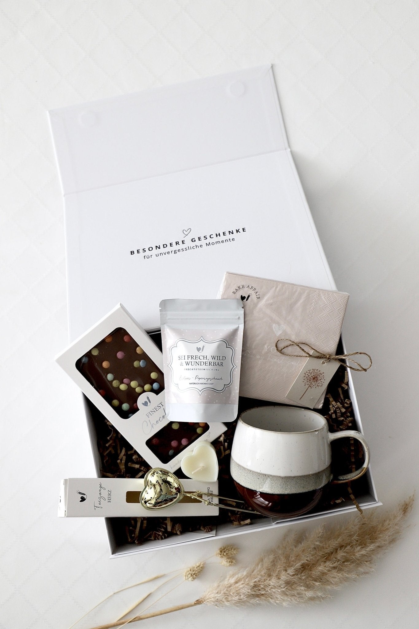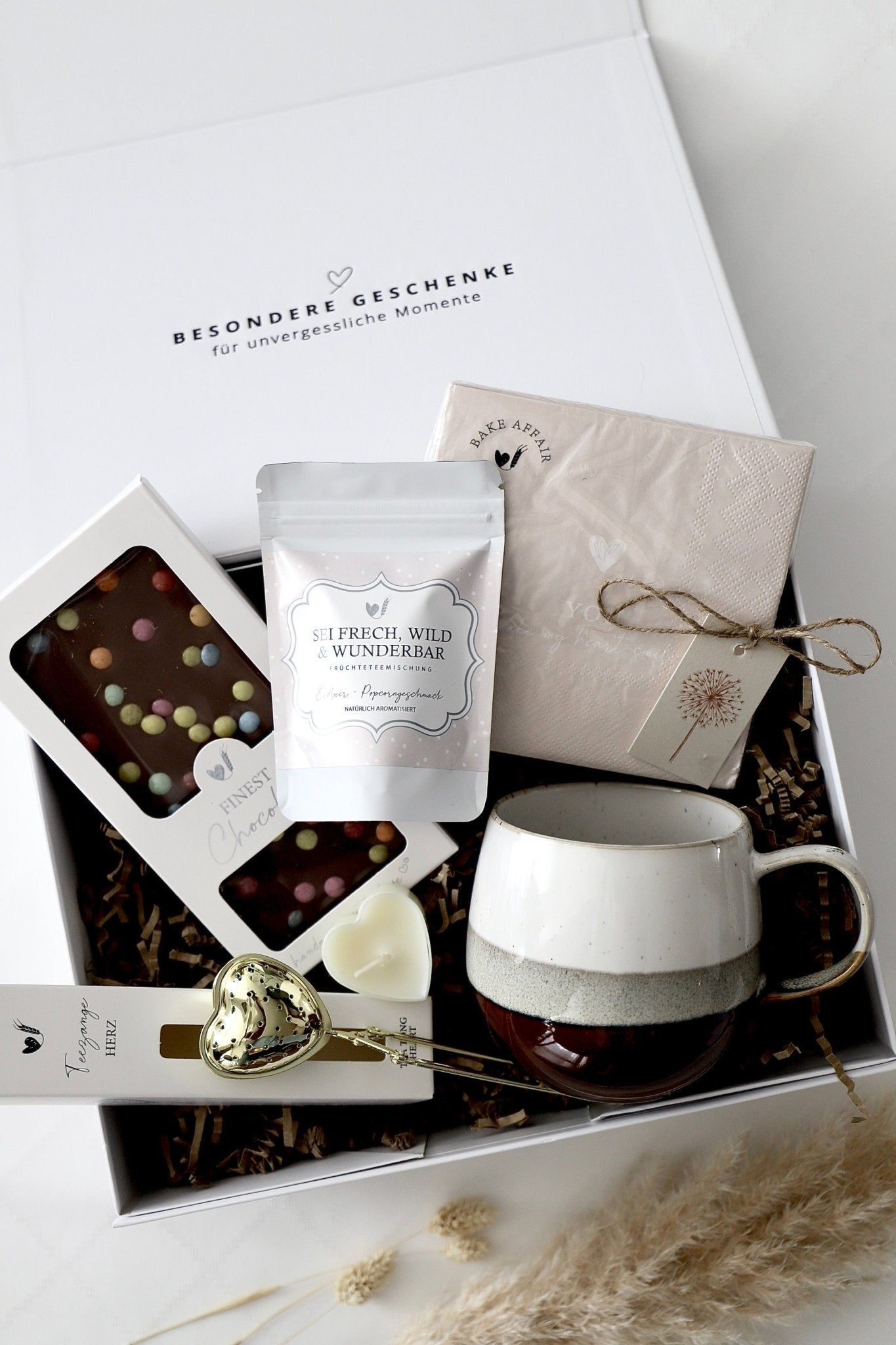 Die „Choco Tea Delight“-Box ist die perfekte Kombination aus Teegenuss und süsser Versuchung. Feiner Tee trifft auf eine edle Schokolade und liebevolle Details, die jede Teepause zu einem besonderen Erlebnis machen. Mit stilvoller Tasse, goldenem Herz-Teesieb und Kerzenlicht wird aus einem einfachen Moment eine kleine Auszeit voller Genuss. Ideal für Schokoladenliebhaber, Teefans und alle, die sich selbst oder andere verwöhnen möchten.