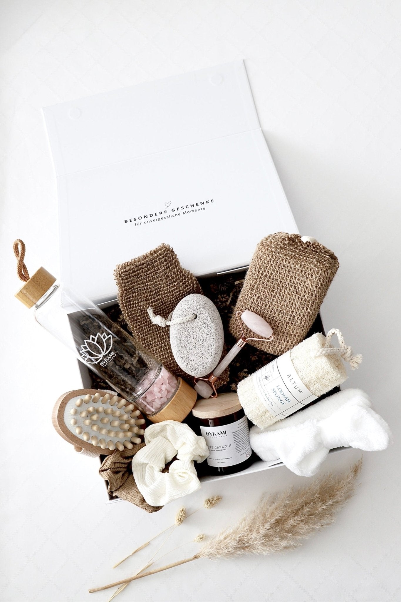 Die „Pure Harmony“-Box ist ein luxuriöses Wellness-Set, das Körper und Geist in Einklang bringt. Mit einer edlen Edelstein-Wasserflasche, wohltuenden Spa-Accessoires und einer sanft duftenden Kerze schenkt sie ein ganzheitliches Verwöhnerlebnis.