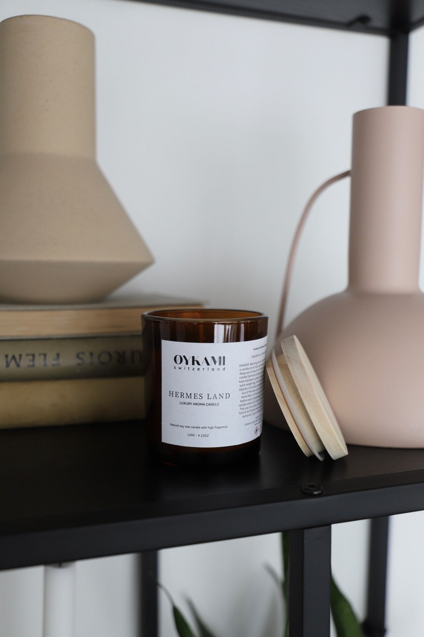 Geniesse luxuriösen Duft mit unserer OYKAMI Kerze aus 100% Sojawachs. Der edle Hermes Land Duft verwandelt dein Zuhause in eine stilvolle Wohlfühloase.