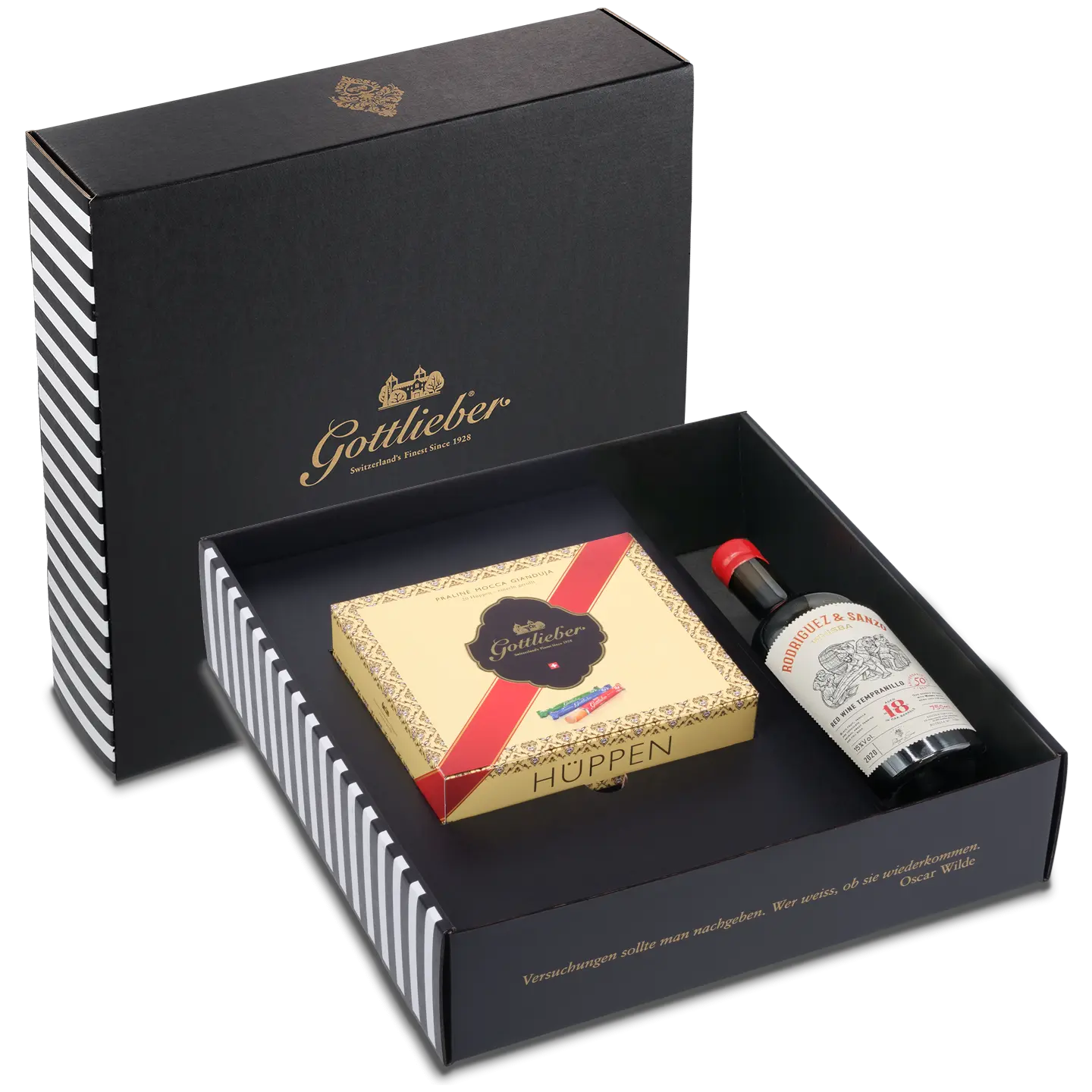 Edle Geschenk-Kollektion mit einer 20er-Packung Gottlieber Hüppen der beliebten Traditionsmischung (Praliné, Mocca, Gianduja) und einer Flasche Rodriguez Sanzo (Whisky-Wine Tempranillo).