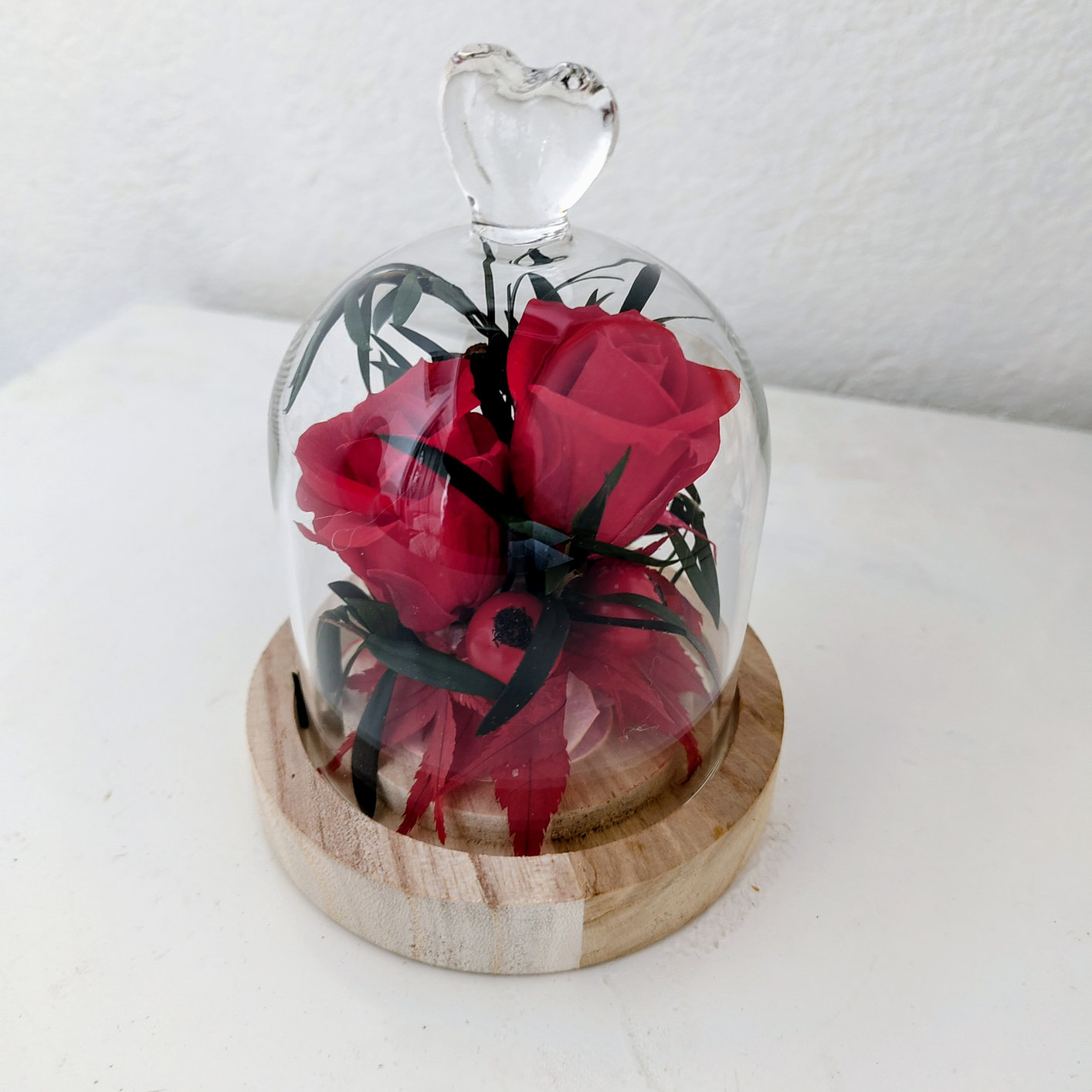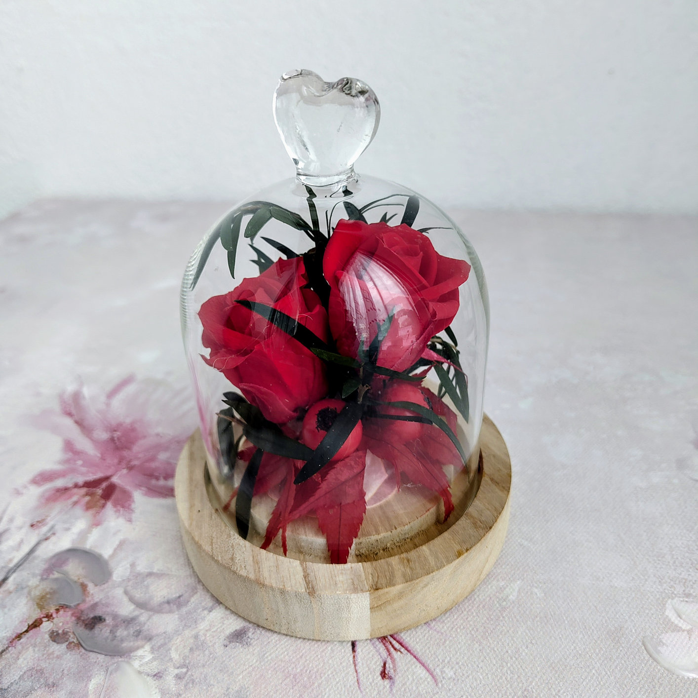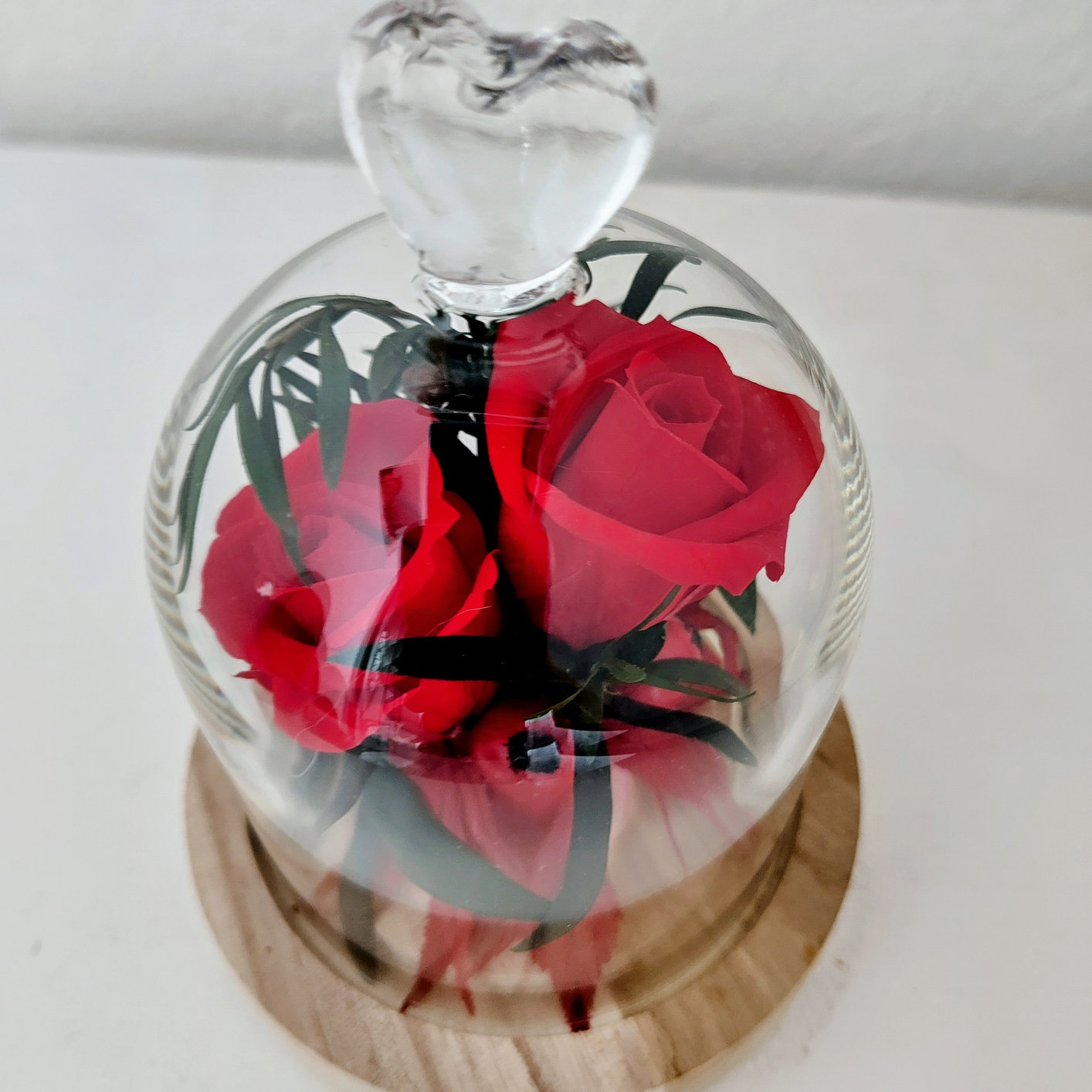 Diese Glasglocke mit einem Herz an der Spitze, bestehend aus zwei konservierten roten Rosen und anderen Pflanzen, ist pflegefrei und hält mehrere Jahre. Ein wunderschönes Geschenk zum Valentinstag, Muttertag oder zu anderen Anlässen.