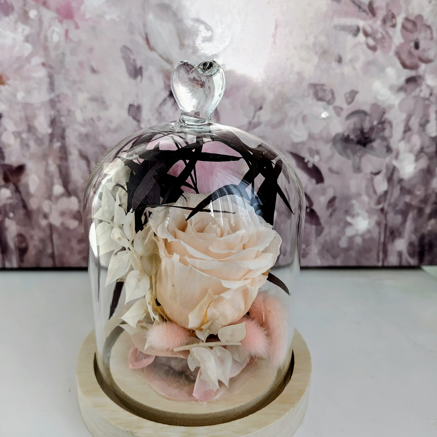 Diese Glasglocke mit einem Herz an der Spitze, bestehend aus einer stabilisierten lachsfarbenen Rose und anderen Pflanzen, ist pflegefrei und hält mehrere Jahre. Ein wunderschönes Geschenk zum Valentinstag, Muttertag oder zu anderen Anlässen.