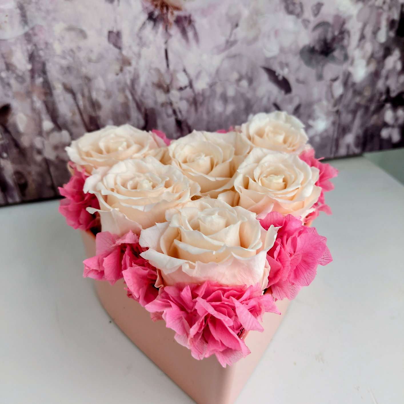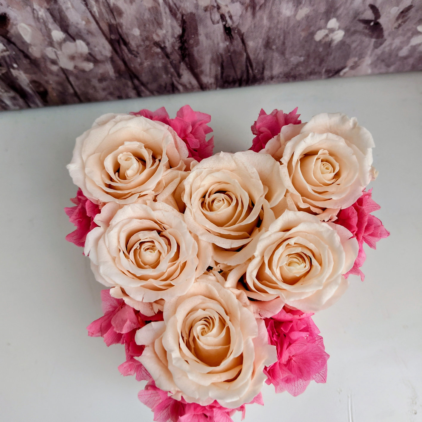 Herzförmiger Schnitt mit stabilisierten Rosen
