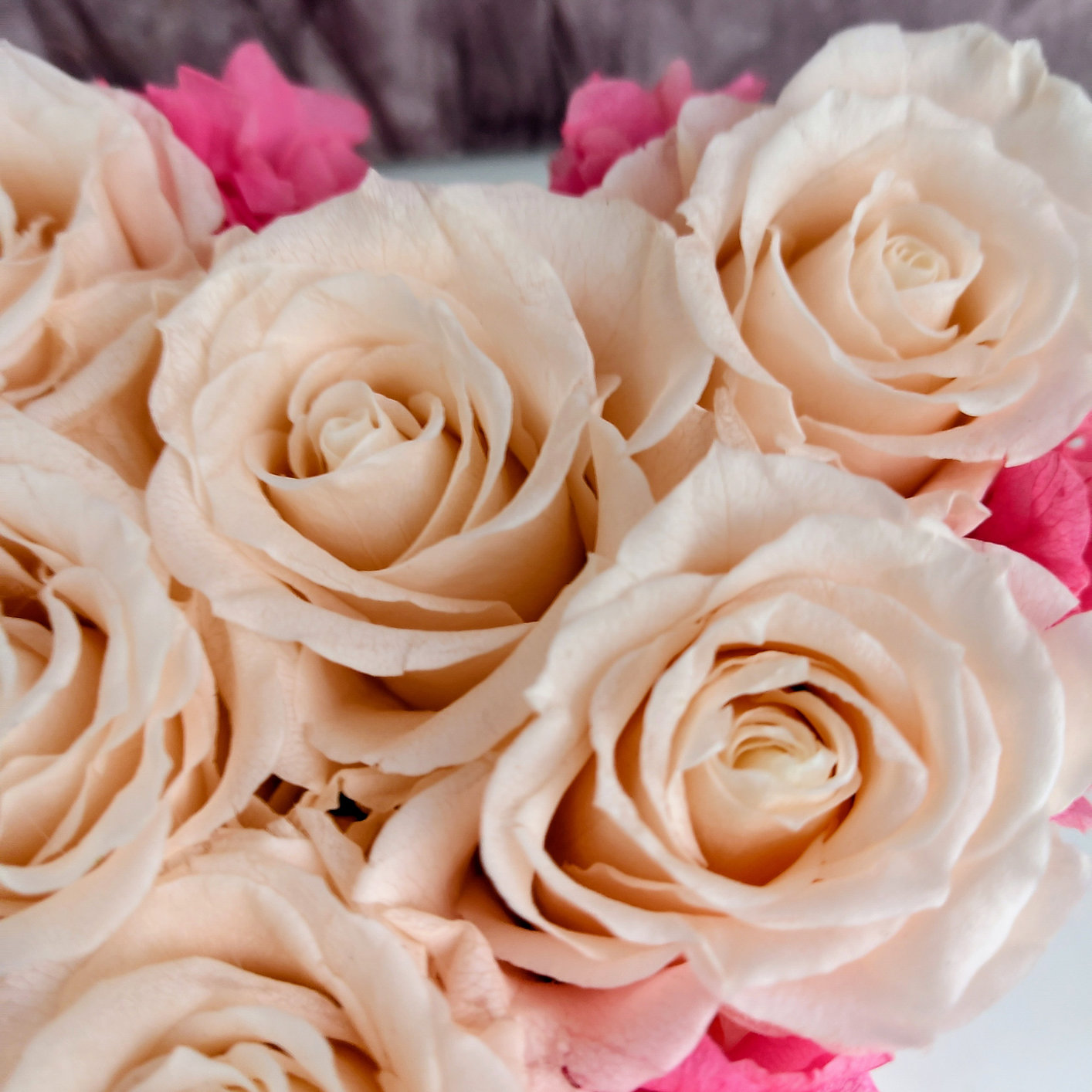 Hübsches Arrangement mit 6 lachsfarbenen Rosen und rosa Hortensien, zum Verschenken mit Liebe und pflegefrei.