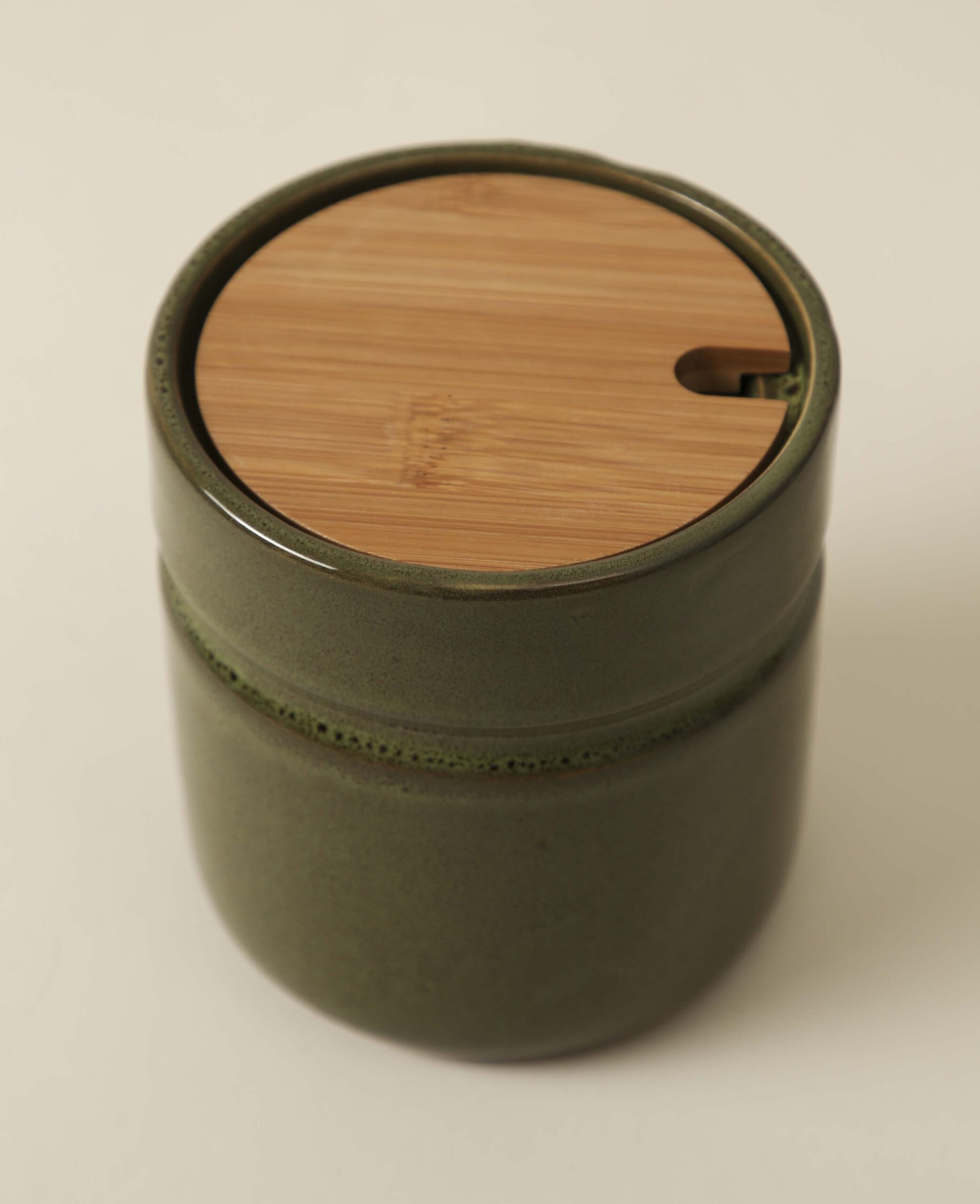Olivgrüne runde Keramikdose mit Holzdeckel, Ø 11 cm x H 12 cm
