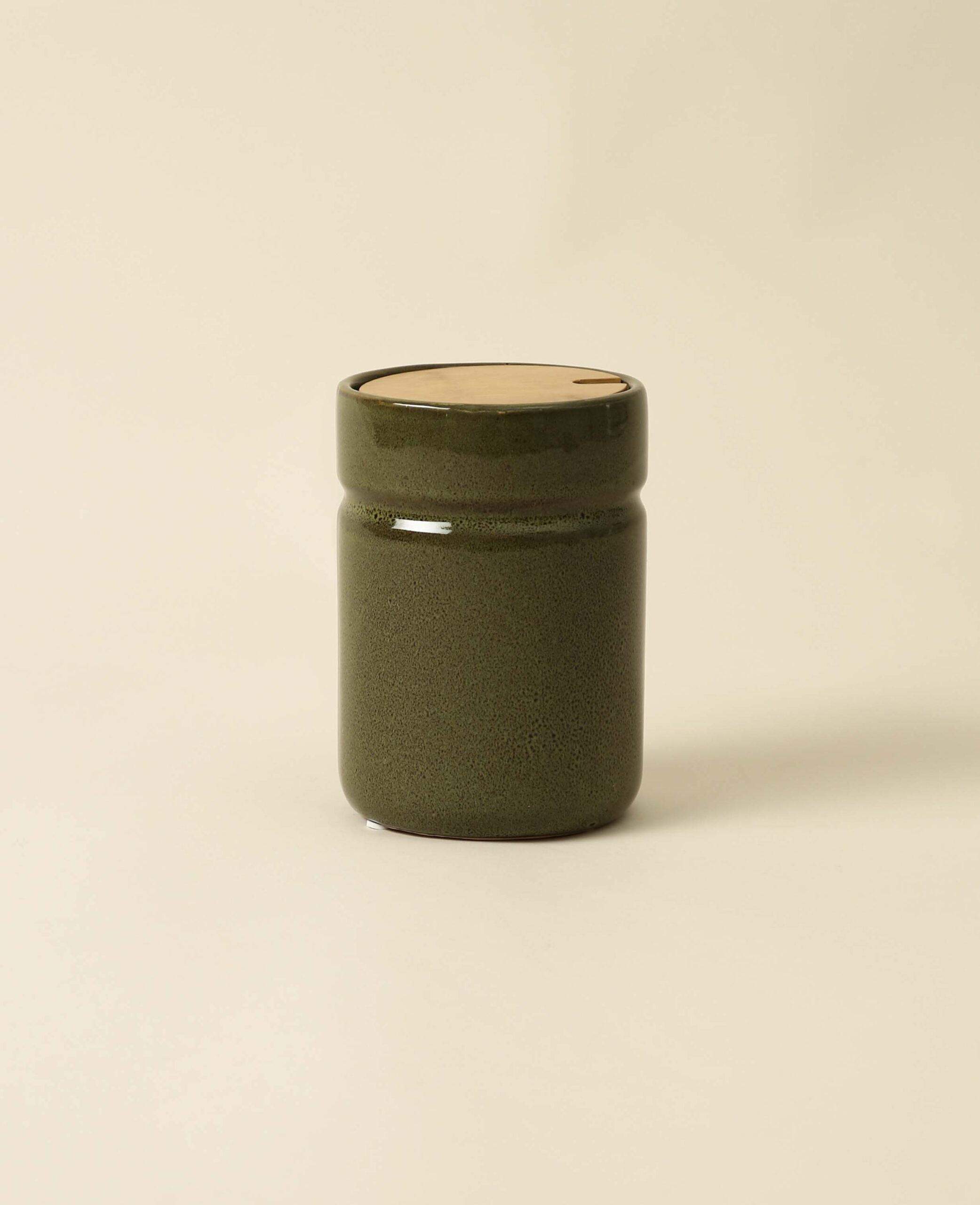 Olivgrüne runde Keramikdose mit Holzdeckel, D 11 cm x H 16 cm