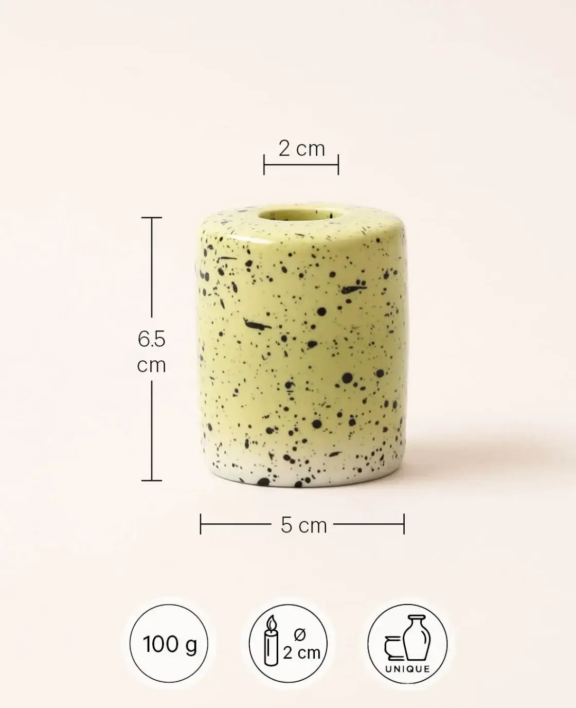 Mit einer Höhe von 6,5 cm und einem Durchmesser von 5 cm bietet er eine ideale Passform für Stabkerzen mit einem Durchmesser von 2 cm. Handgefertigt und mit Liebe zum Detail gestaltet, bringt dieser trendy Kerzenständer Stil in deine Räume.