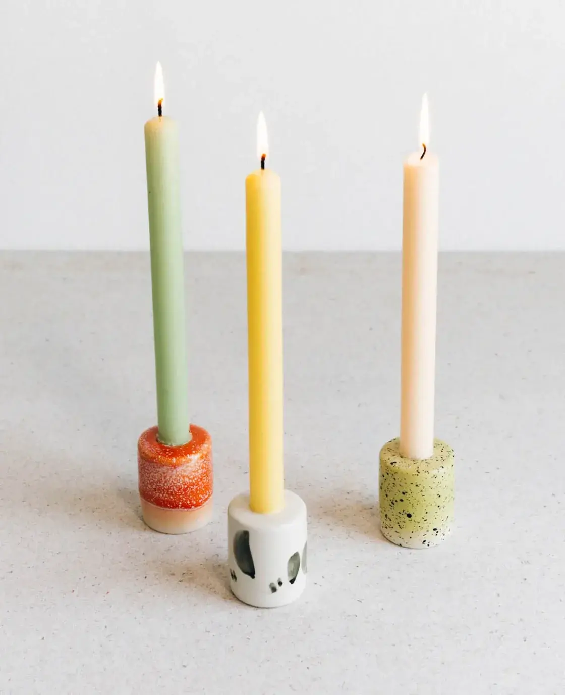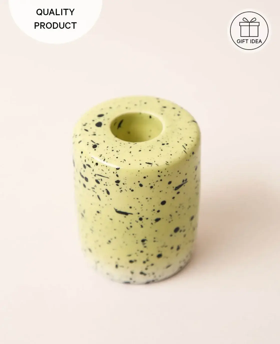 Verleihe deinem Zuhause eine warme Atmosphäre mit unserem stilvollen Kerzenständer aus hellgrüner Keramik mit schwarzen Sprenkeln. Dieser einzigartige Kerzenständer ist die perfekte Ergänzung für dein Wohnambiente.