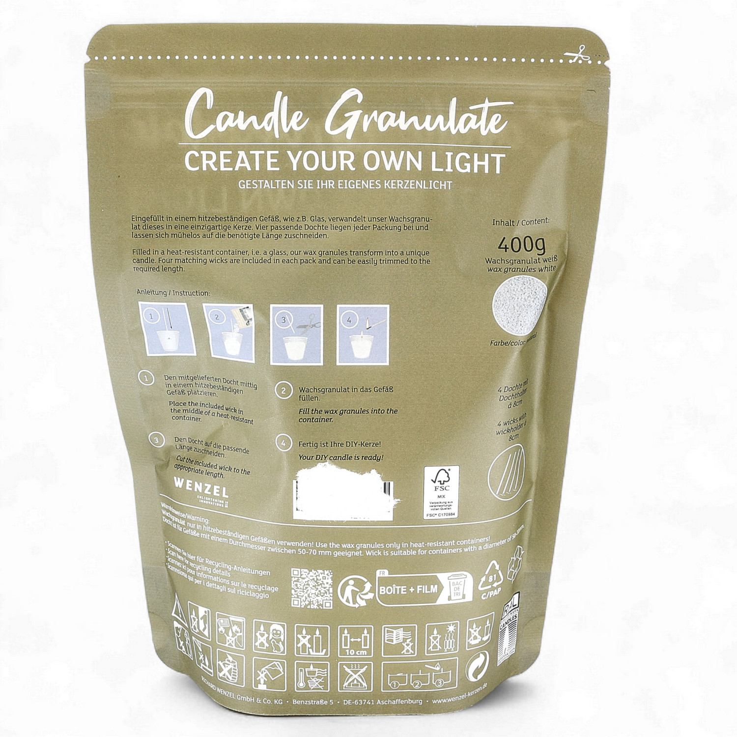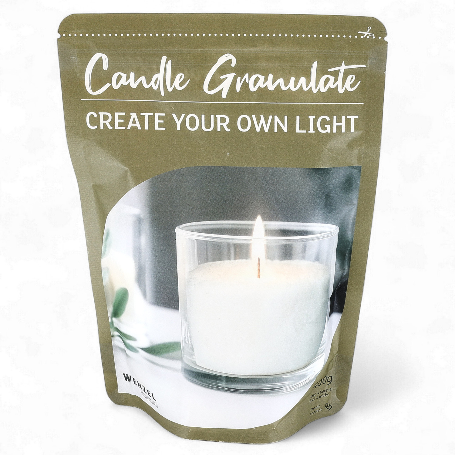 Jede Packung enthält 400 g weisses Wachsgranulat sowie vier passende Dochte, die sich leicht auf die gewünschte Länge zuschneiden lassen.