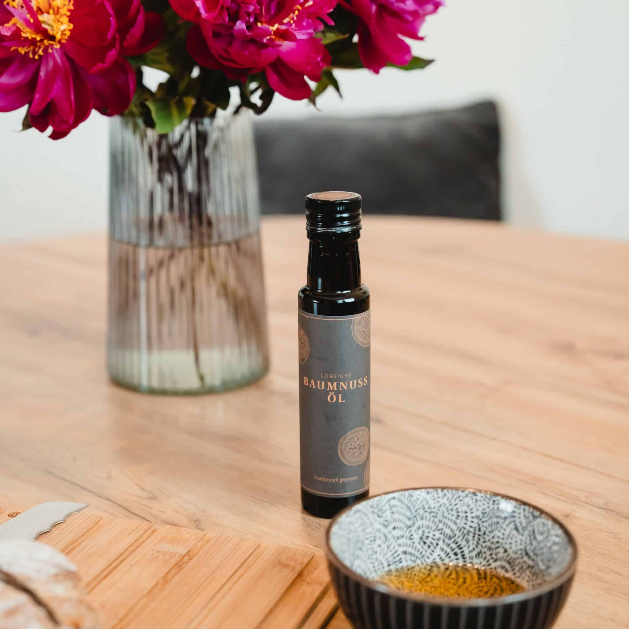 Traditionell gepresstes Öl aus Lobsiger Baumnüssen. Perfekt zum Apero mit knusprigem Brot und etwas Fleur de Sel.