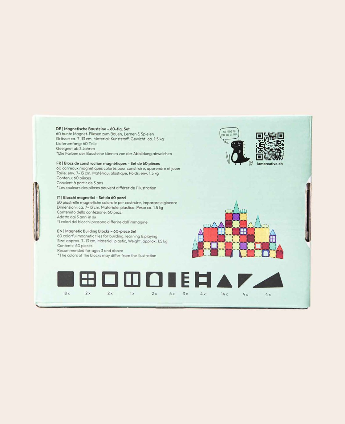 Bestelle diese Magnet Bausteine im 60-teiligen Set und fördere die Motorik sowie Kreativität Deiner Kinder. Die bunten, magnetischen Fliesen garantieren einen hohen Spassfaktor beim Erstellen von Schlössern, Häusern oder Figuren. Zudem eignet sich das Spielzeug auch als ideale Geschenkidee an Geburtstagen, Weihnachten oder Ostern.