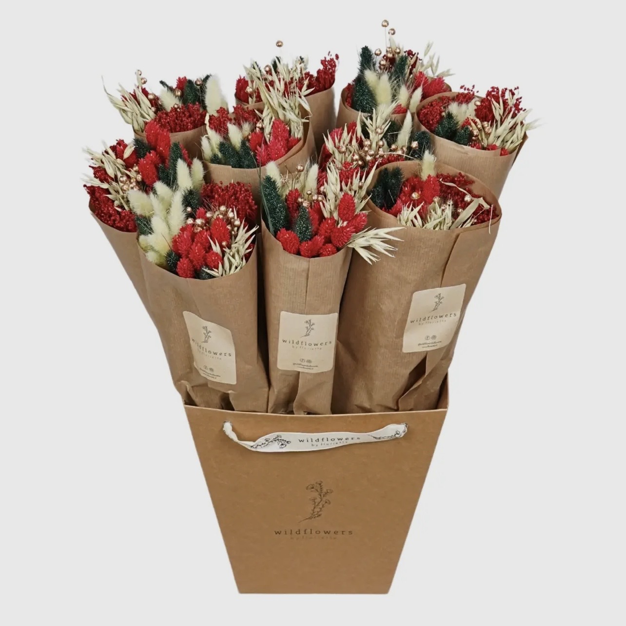 Mit natürlichen Hafer, rotem Phalaris, hellgrünem Lagurus, hellgrünem Linum, kupferfarbenem Lupidium und rotem Besenblumen – perfekt für einen fröhlichen und saisonalen Touch mit lebendigen Feiertagstönen. Jeder Strauss wird sorgfältig von Hand gebunden, um ein natürliches und authentisches Aussehen zu gewährleisten.