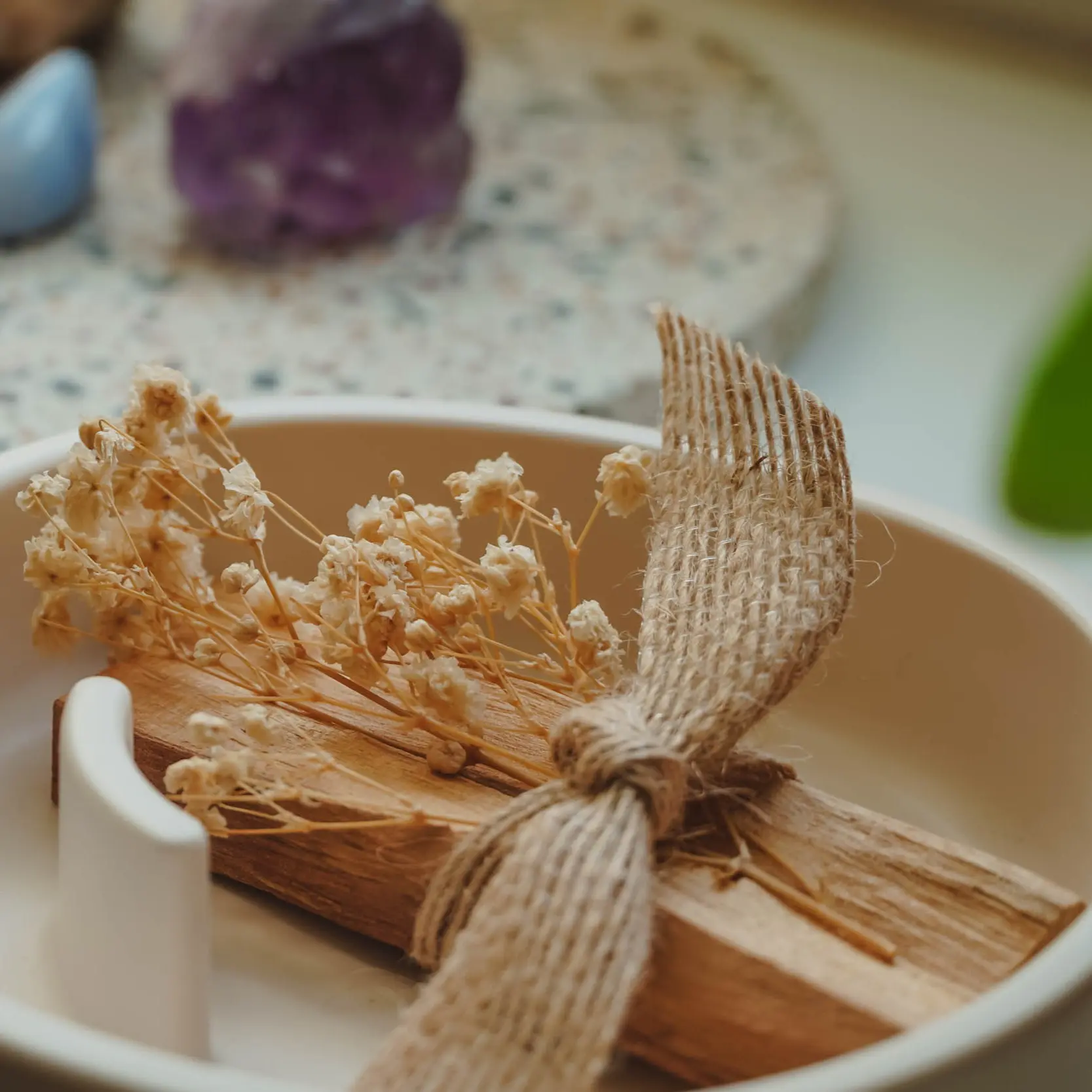 Für dieses Geschenkset wird Mesa in einem warmen Crèmeton gefertigt und mit zwei nachhaltig geernteten Palo-Santo-Sticks aus Fiore D’Oriente, Peru kombiniert. Palo Santo ist bekannt für sein wohlig-holziges Aroma mit zarten Zitrusnoten und wird traditionell zur Reinigung und für Momente der Ruhe verwendet.