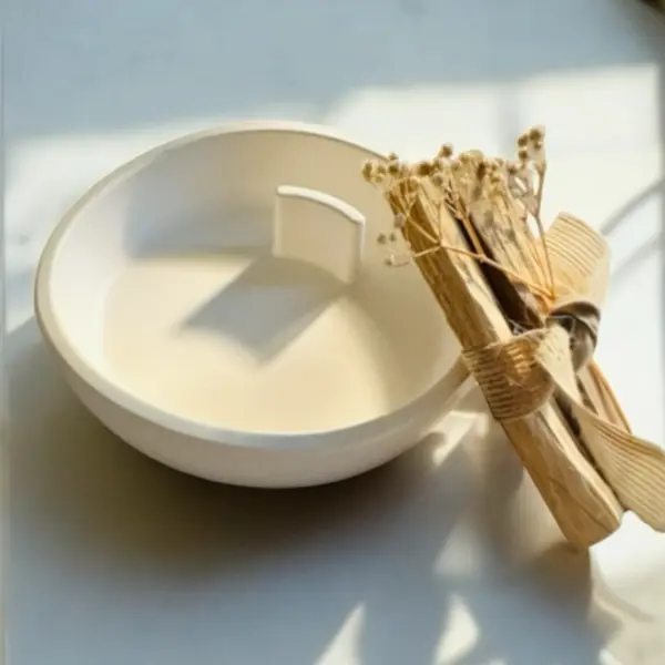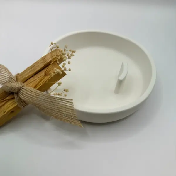 Mesa ist ein handgefertigter Palo-Santo-Halter aus einem mineralbasierten Eco-Material. Die sanft gerundete Form und der leicht unregelmässige Rand verleihen ihm eine natürliche, organische Ausstrahlung.