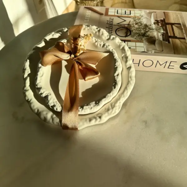 Die beiden Teller werden mit einem champagnerfarbenen Band und einem kleinen saisonalen Kranzstiel gebunden – eine liebevolle, schlichte Präsentation, die sich perfekt als Geschenk eignet. Ein warmes Zeichen der Wertschätzung, ideal für Gastgeberinnen und Gastgeber, für besondere Momente oder als stilvolles Wohnaccessoire.