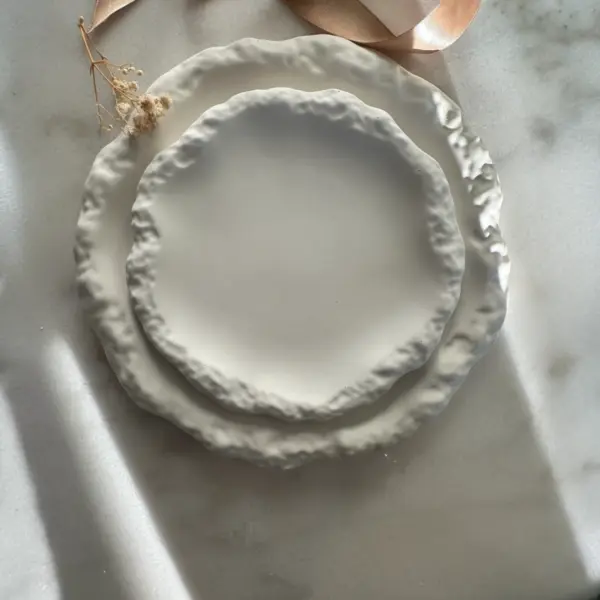 Das Petra Duo besteht aus zwei weich geschwungenen Tellern, deren Form an von Wasser gezeichnete Wellen erinnert. Die sanften Crème-Töne, die matte Oberfläche und die organischen Konturen verleihen dem Set eine zeitlose Ästhetik und machen es zu einem vielseitigen Akzentstück – ob als Centerpiece mit Kerzen, als Servierteller für Früchte oder Pralinen, oder als reine Deko-Objekte.
