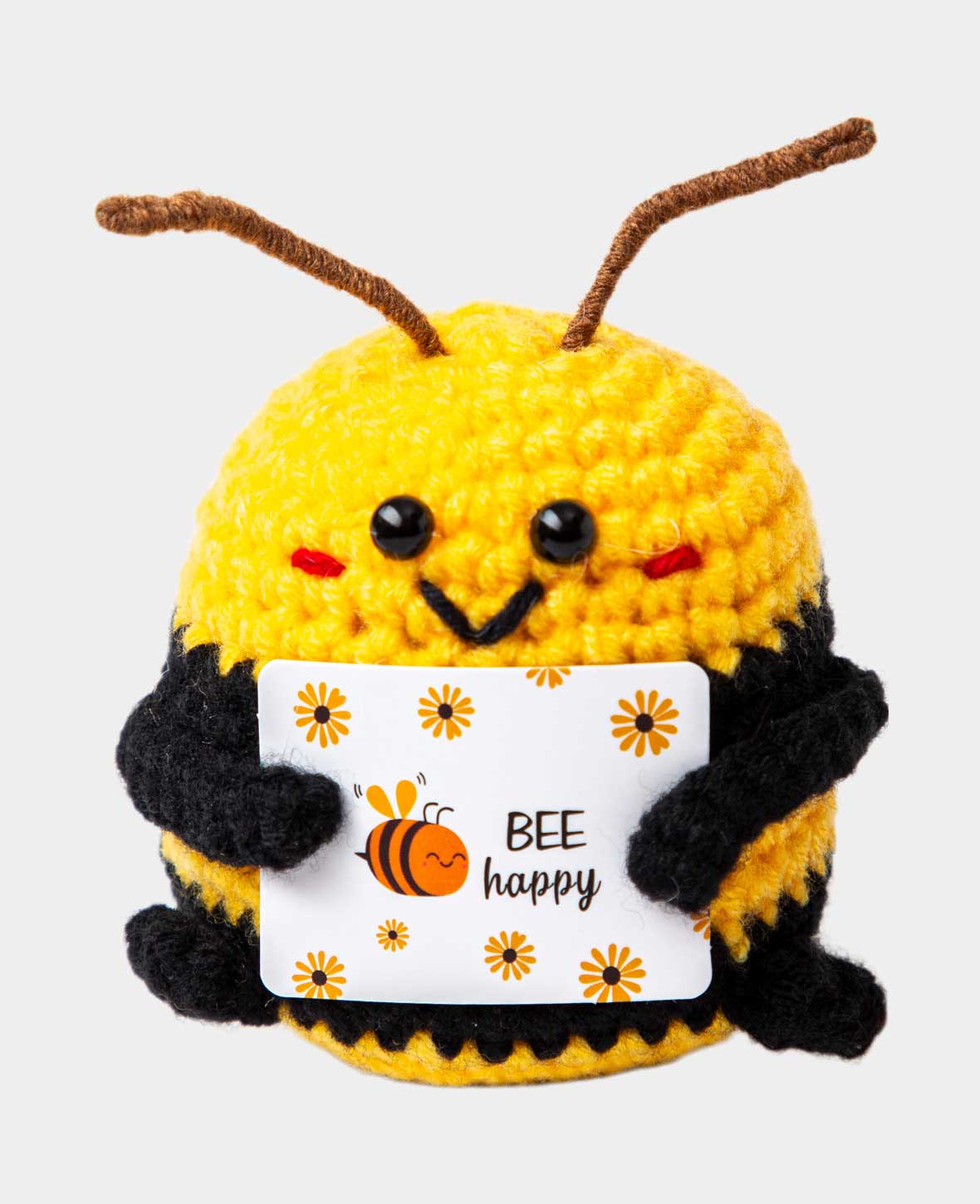 Die Positive Bee ist ein handgehäkelter Glücksbringer in fröhlichem Gelb mit dem kurzen und positiven Spruch:
