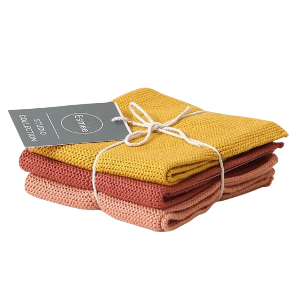 Die drei hochwertigen Spültücher in Senfgelb, Rostrot und Coral aus gestrickter Baumwolle eignen sich wunderbar zum Spülen oder Putzen der Küche und des Bads. Alternativ lassen sie sich auch ideal als Gesichts- oder Handtücher verwenden, da ihre weiche Struktur, frei von Mikroplastik, für eine sanfte Reinigung sorgt. Die Tücher aus 100% Baumwolle lassen sich bei ca. 40 – 60 Grad waschen und messen 25 x 25 cm.