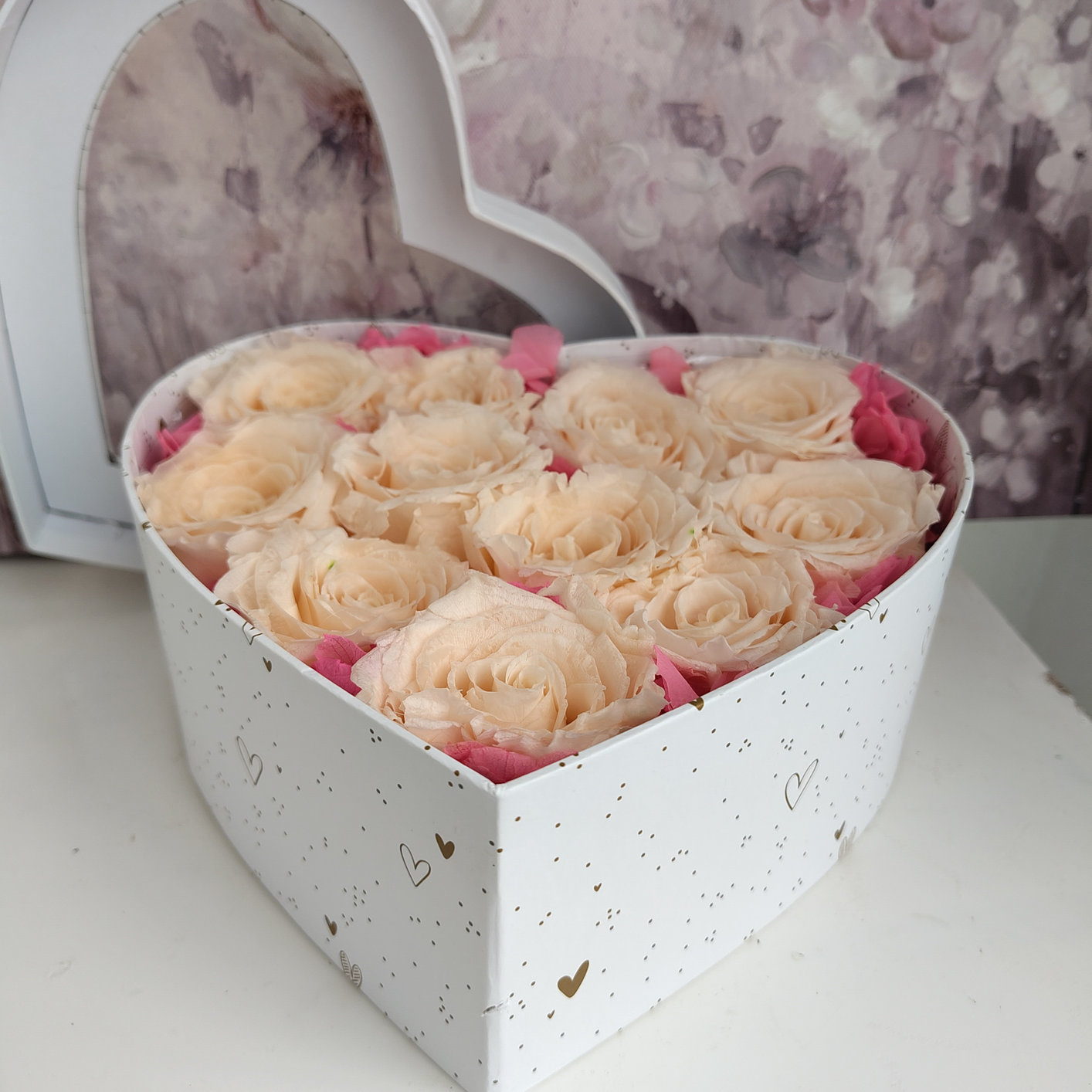 Diese wunderschöne Schachtel enthält 11 hellrosa Rosen und rosa Hortensien – ein wunderschönes Geschenk zum Muttertag oder zu jedem anderen Anlass, dass du mit Zärtlichkeit überreichen kannst. Es handelt sich um konservierte Blumen, die pflegeleicht sind, mehrere Jahre halten.