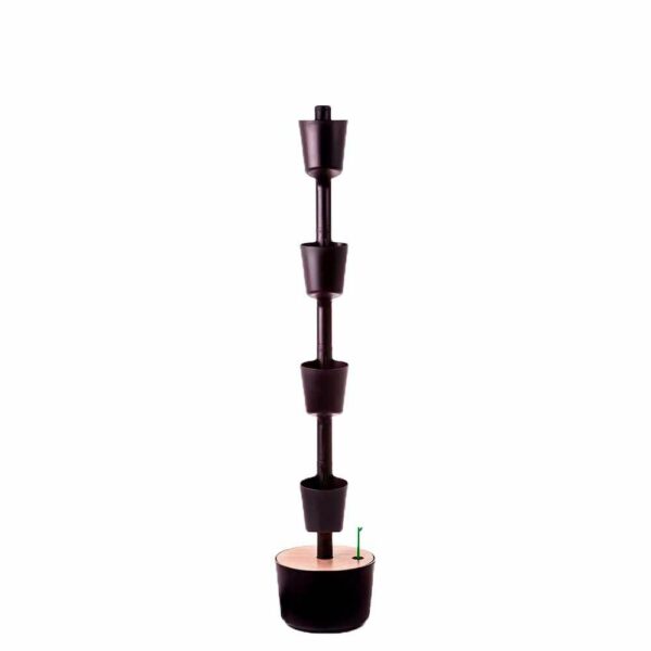 Selbstbewässernder vertikaler Pflanzkübel in schwarzer Farbe und Deckel aus Kiefernholz. Modular und anpassbar. Modell mit 4 Töpfen. Höhe 148 cm. Durchmesser der Töpfe 13 cm. Inklusive erstklassiger Nährstoffe. Mit automatischem Kreislaufbewässerungssystem mit 30 Tagen Autonomie.