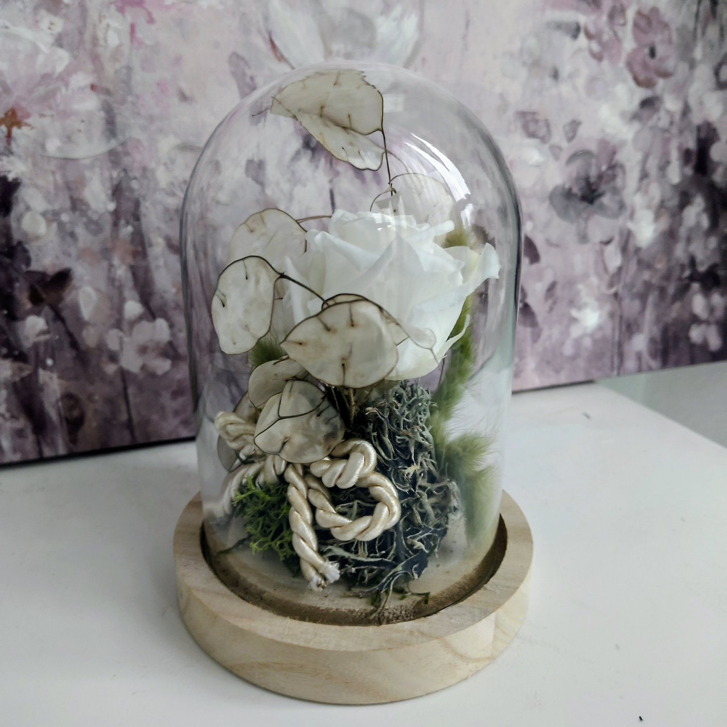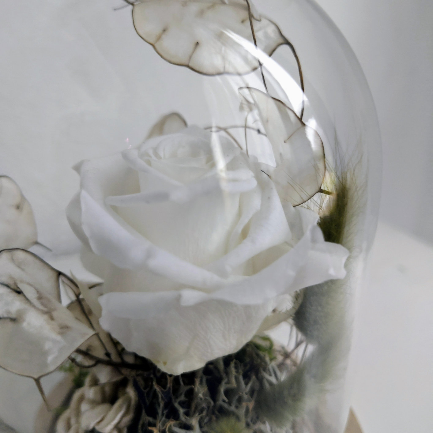 Diese schöne Glasglocke enthält eine wunderschöne konservierte weisse Rose, getrocknete Pflanzen und konserviertes Moos, ist handgefertigt, pflegefrei und hält mehrere Jahre.