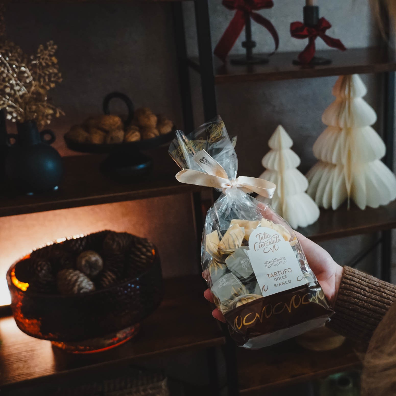 Handgearbeitete weisse Tartufi aus heller Haselnusscreme und ganzen Haselnüssen – umhüllt in weisser Schokolade und mit Puderzucker bestäubt.