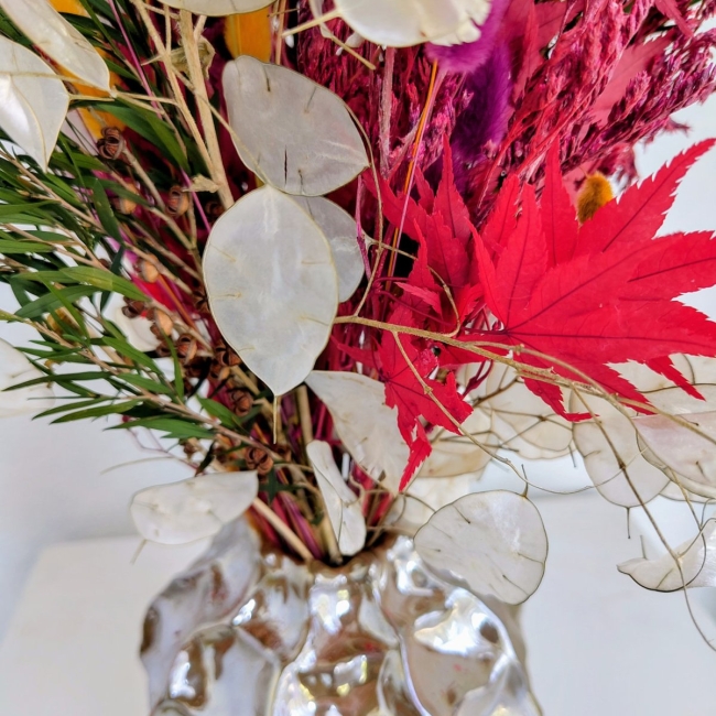 Wunderschöner Strauss aus getrockneten und stabilisierten Blumen, die Vase ist im Preis inbegriffen.