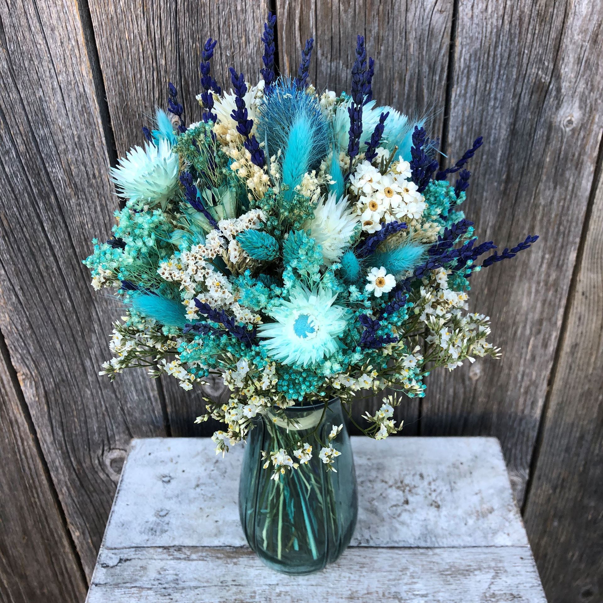 Trockenblumen – Der neue Interior-Trend; Trockenblumen Strauss Bund mix «Türkis-Weiss» mit Vase Ø ca.17 cm H ca.30 cm / Vase leer ohne Strauss H ca. 18 cm