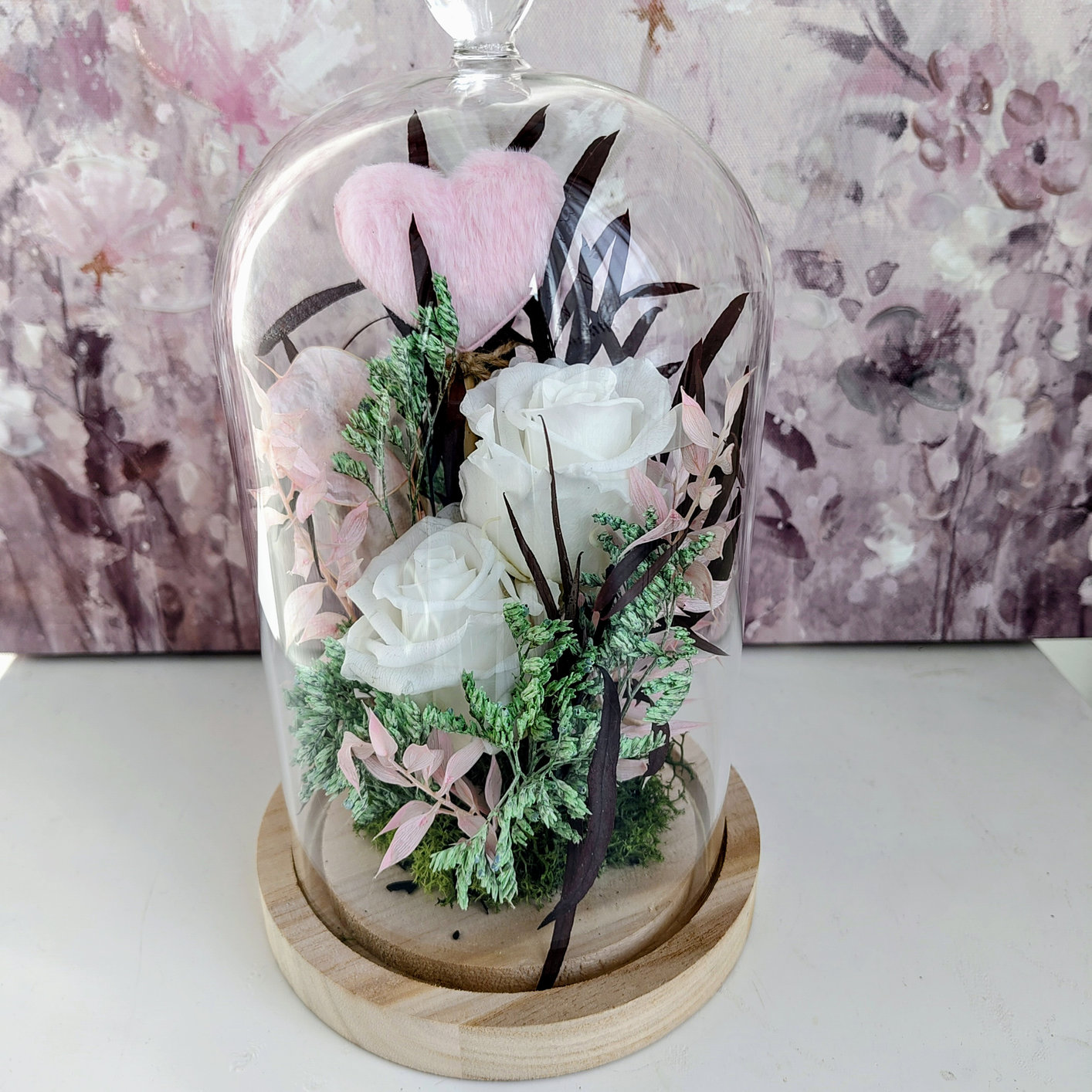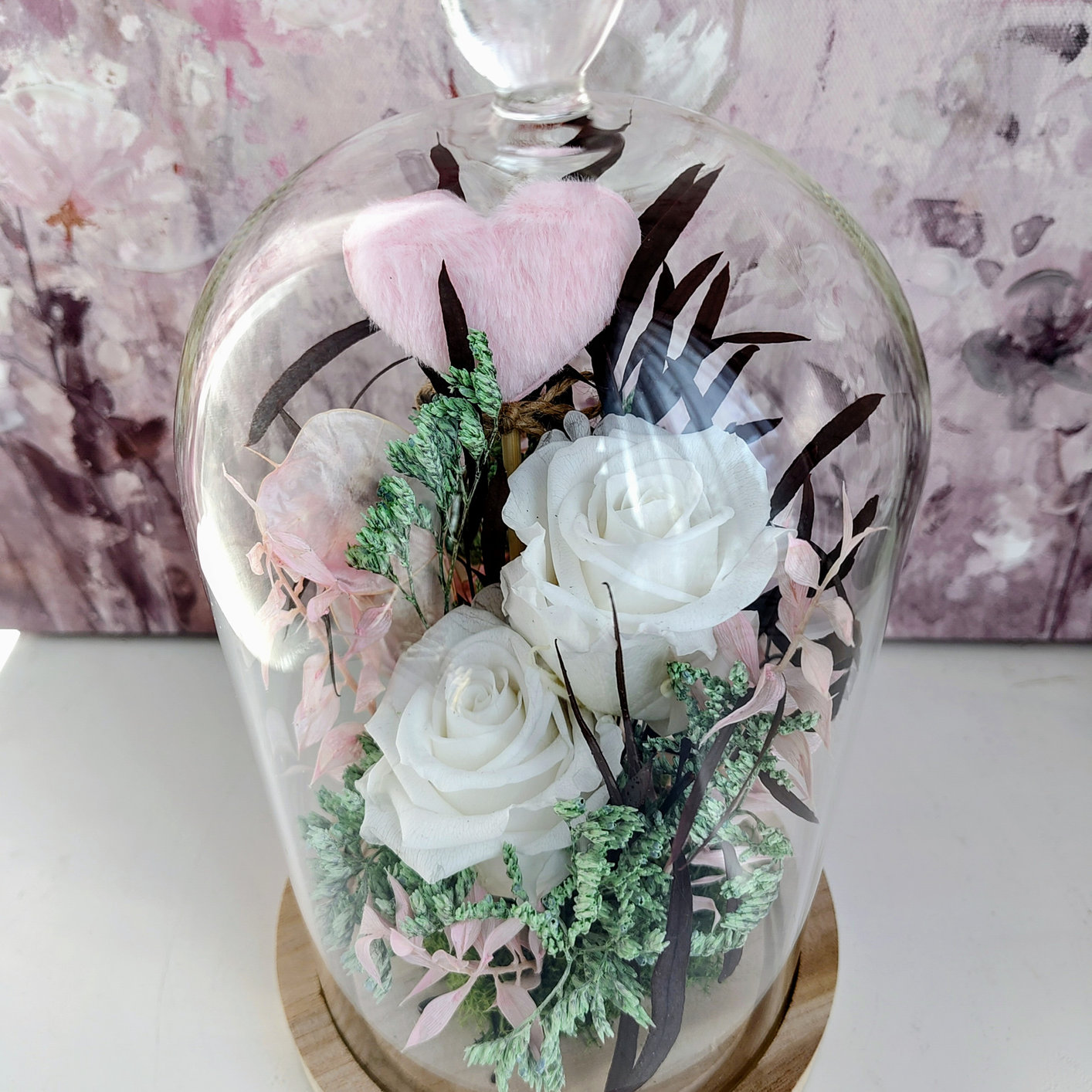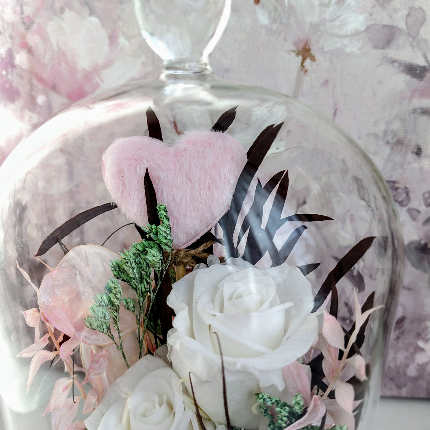 Diese Glasglocke mit einem Herz an der Spitze, bestehend aus zwei konservierten weissen Rosen und anderen Pflanzen, ist pflegefrei und hält mehrere Jahre. Ein wunderschönes Geschenk zum Valentinstag, Muttertag oder zu anderen Anlässen.