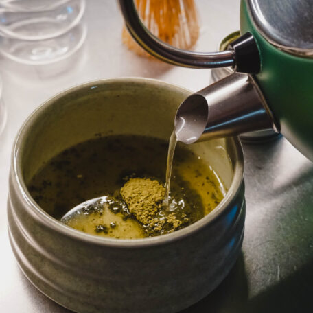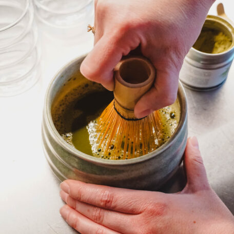 Traditionell wird Matcha mit heissem Wasser aufgeschlagen. Das Ergebnis ist ein cremiger, leicht schaumiger Tee – perfekt für eine bewusste Auszeit.