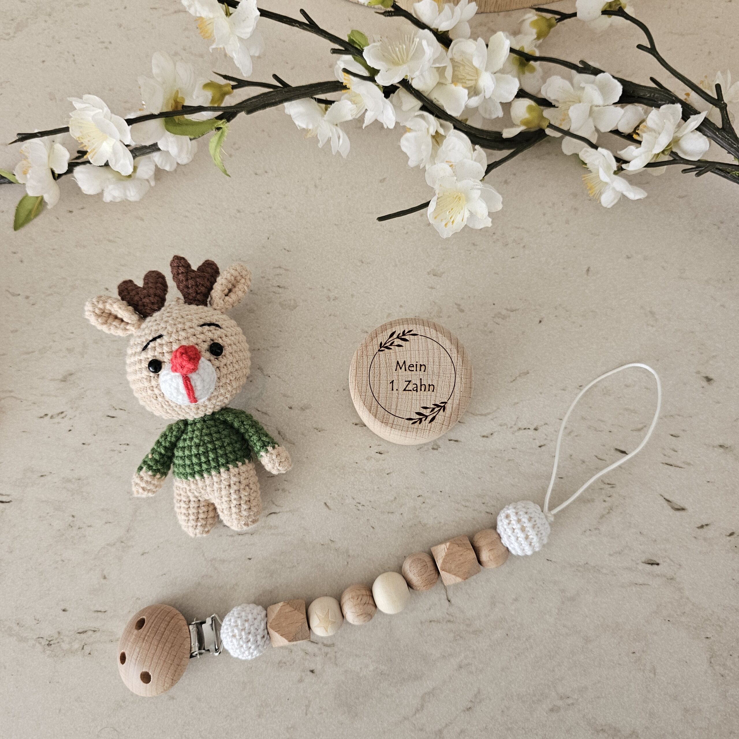 Unser 3er Set süsses Rentier ist das ideale Geschenk zur Geburt, Taufe oder Babyparty für echte kleine Weihnachtsfans. Es enthält eine Schnullerkette, eine Zahndose und ein Häkel Mini-Rentier.